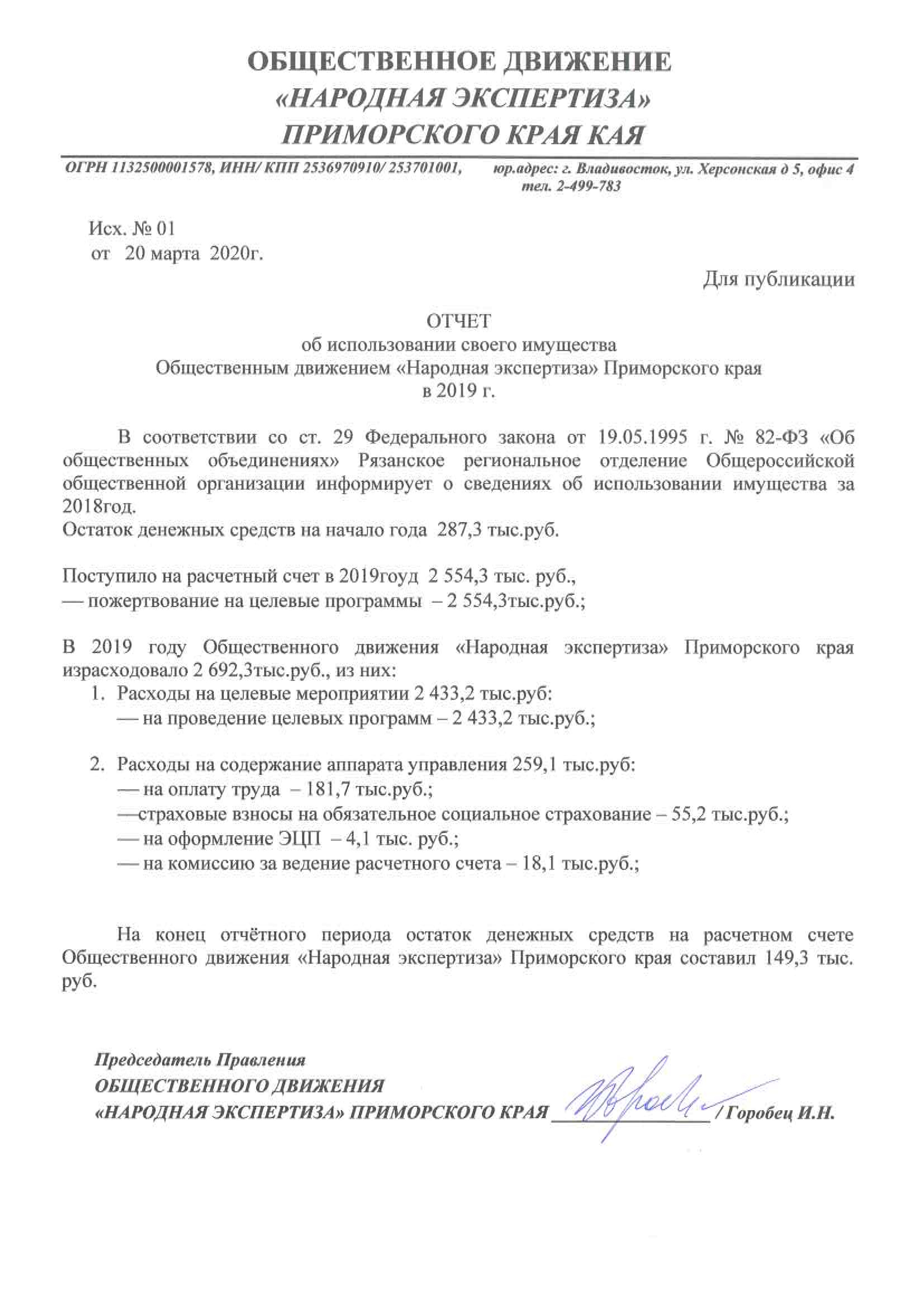об использовании своего имущества Общественным движением «Народная экспертиза» Приморского края в 2019 г.