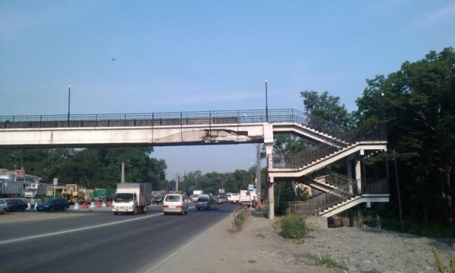 ВЛАДИВОСТОК, 29 июня, PrimaMedia. Уже несколько дней аварийный виадук для пешеходов функционирует на федеральной трассе М-60, в районе остановки "Океанская" во Владивостоке. Он угрожает безопасности движения, водители и пассажиры личного транспорта с опаской проезжают этот участок. Причиной такого состояния виадука, вероятней всего послужил мощнейший удар по нему спецтехникой, которая передвигалась по дороге с негабаритным грузом, сообщает корр. РИА PrimaMedia.
