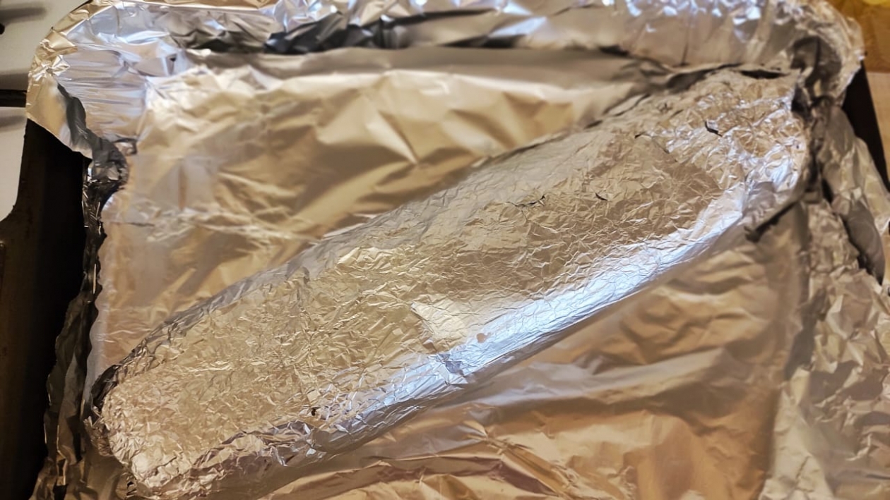 Закрываем плотно фольгу по краям. Дно противня застилаем фольгой и выкладываем рулет.