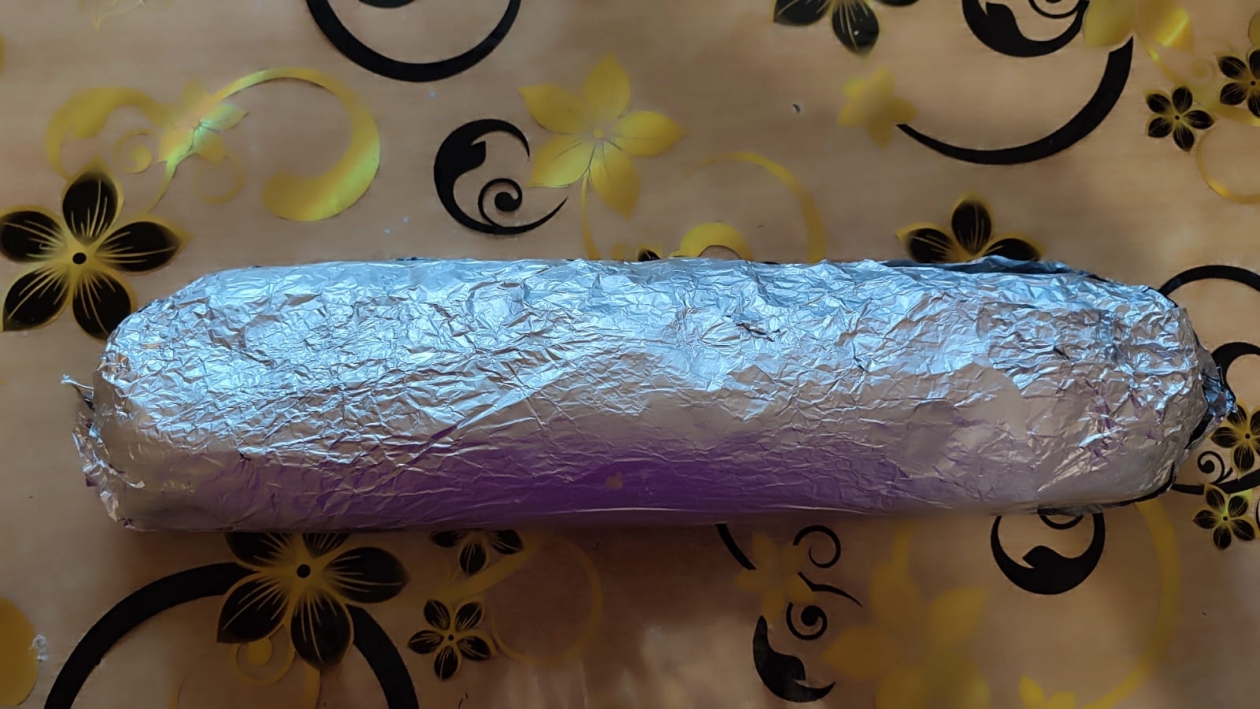 Фольгой плотно сворачиваем всё в рулет. Для этого следует приподнять один край фольги с основой и завернуть его на начинку, придавливая слегка руками.