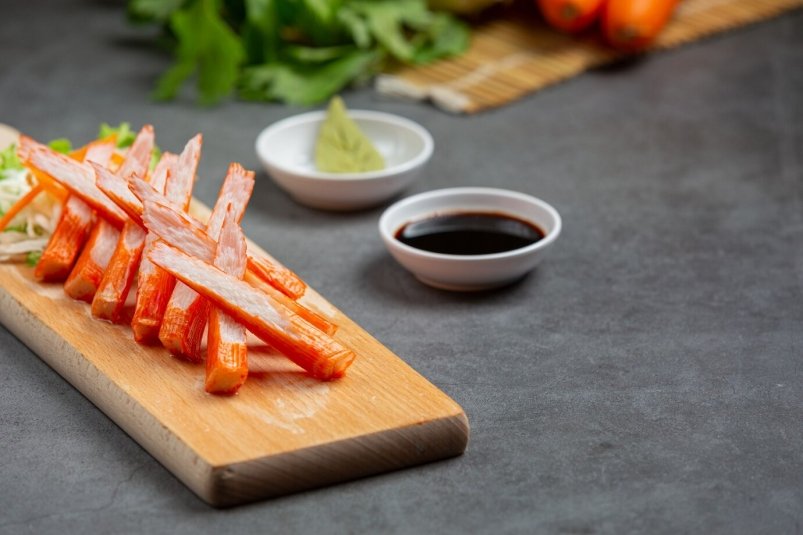 1. Отложите 3−4 крабовых палочки для крем-соуса. Остальные нарежьте полосками шириной около 1 см.