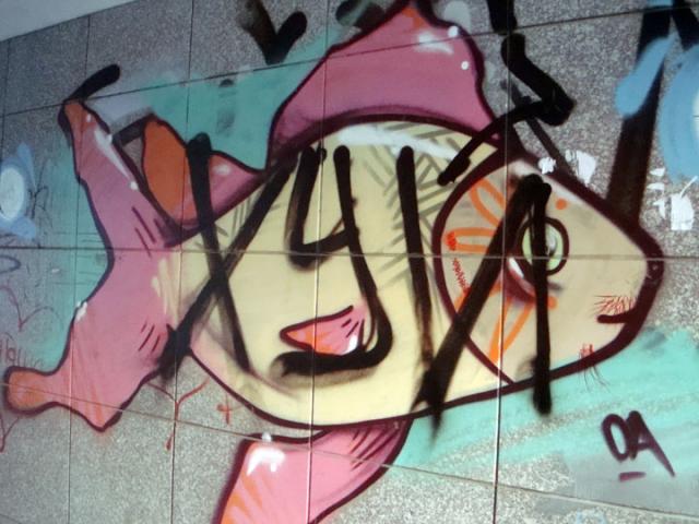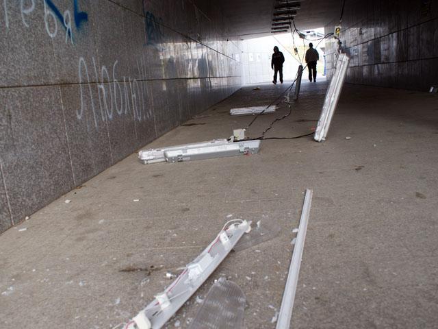 Мало того, что граффисты разрисовали переходы, сейчас же лихая молодежь разбила гранитную плитку на стенах.