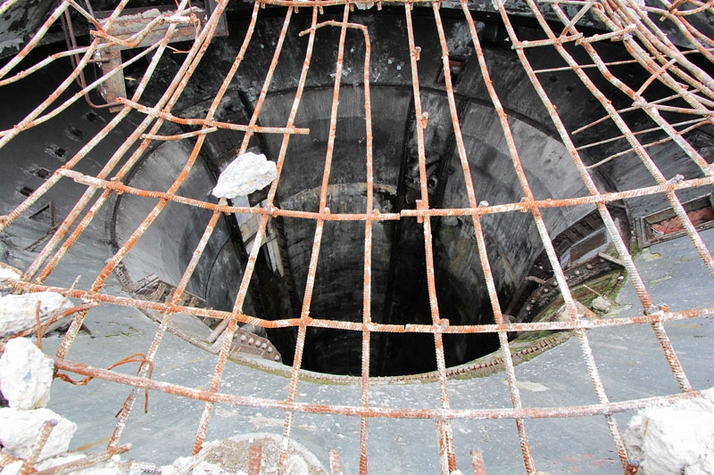 Сейчас одна из железобетонных конструкций колпака шахт разрушается и из нее уже виднеется металлическая арматура.