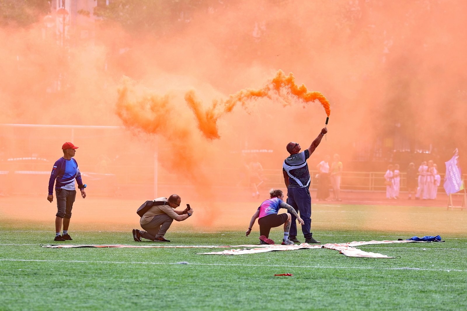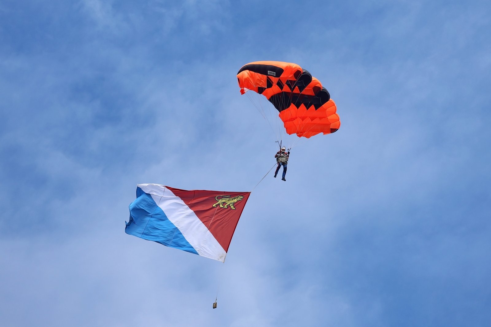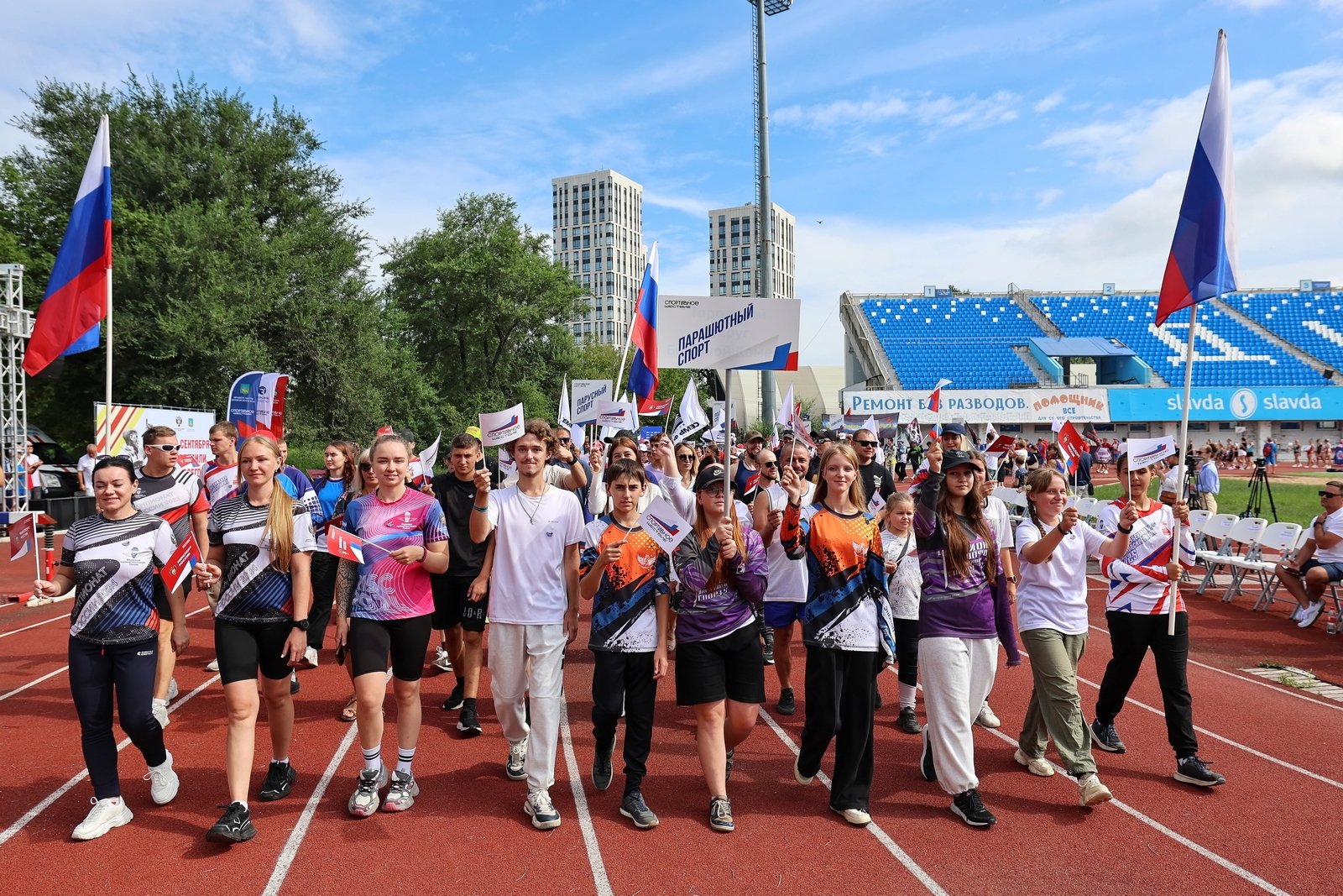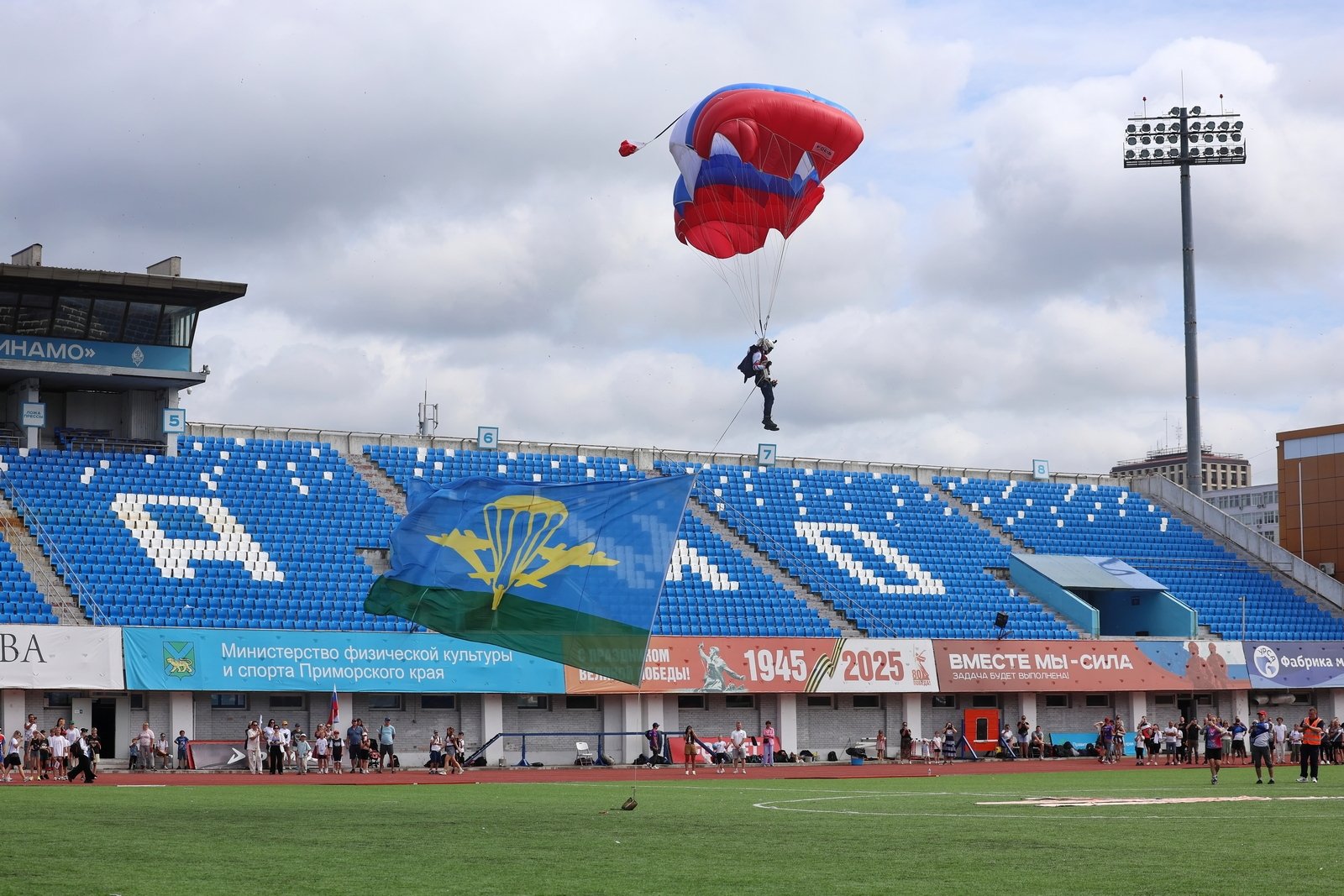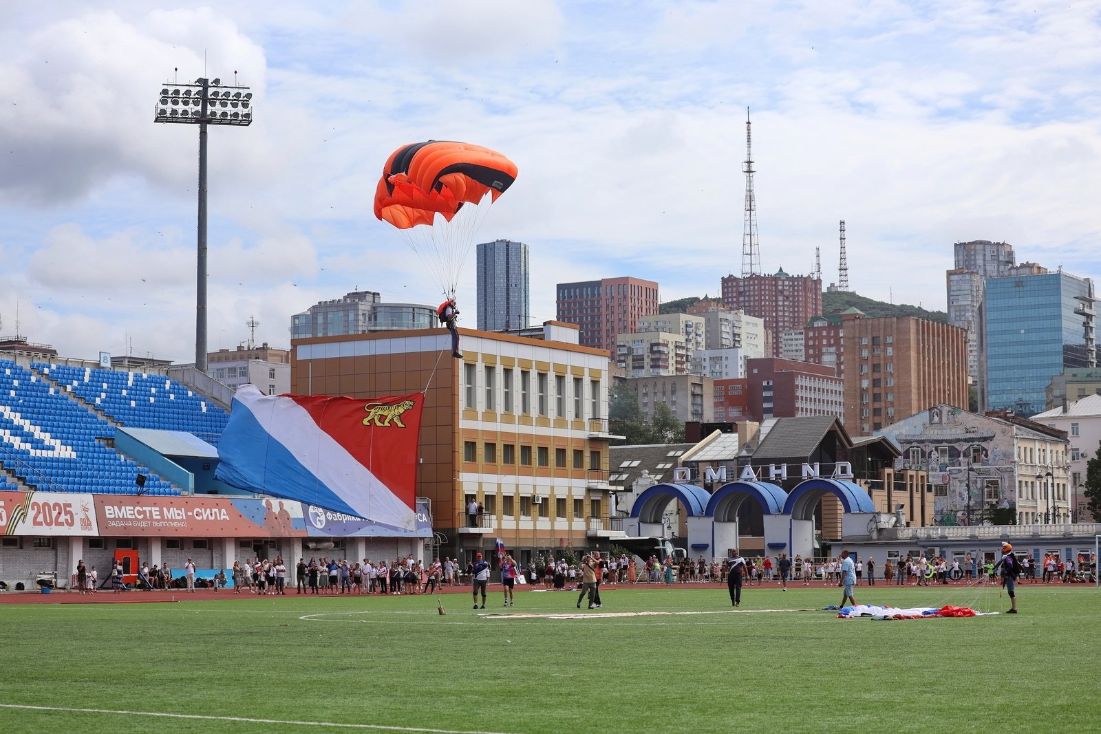 Одним из самых зрелищных моментов праздника стало эффектное выступление парашютистов. Спортсмены приземлились прямо на поле стадиона, развернув огромные флаги России и Приморского края, что вызвало бурные аплодисменты зрителей.