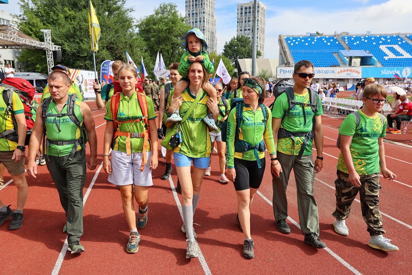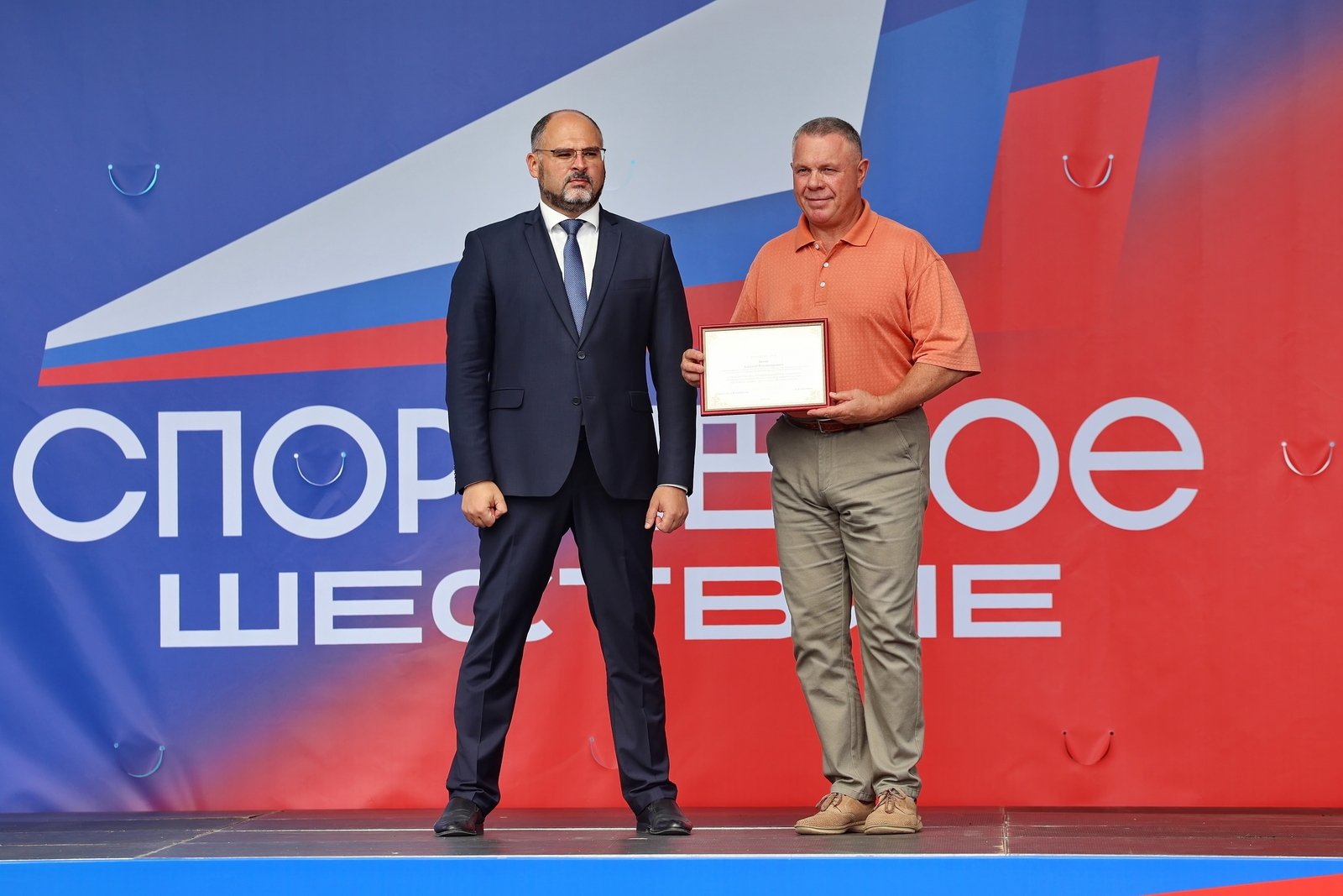 В праздничной колонне прошли гимнасты, хоккеисты, футболисты, стрелки, шахматисты, легкоатлеты, а также спидвейная команда "Восток", которая лидирует в нынешнем командном чемпионате России. Вместе со всеми шел капитан "Востока", шестикратный чемпион страны, чемпион Европы Григорий Лагута.
