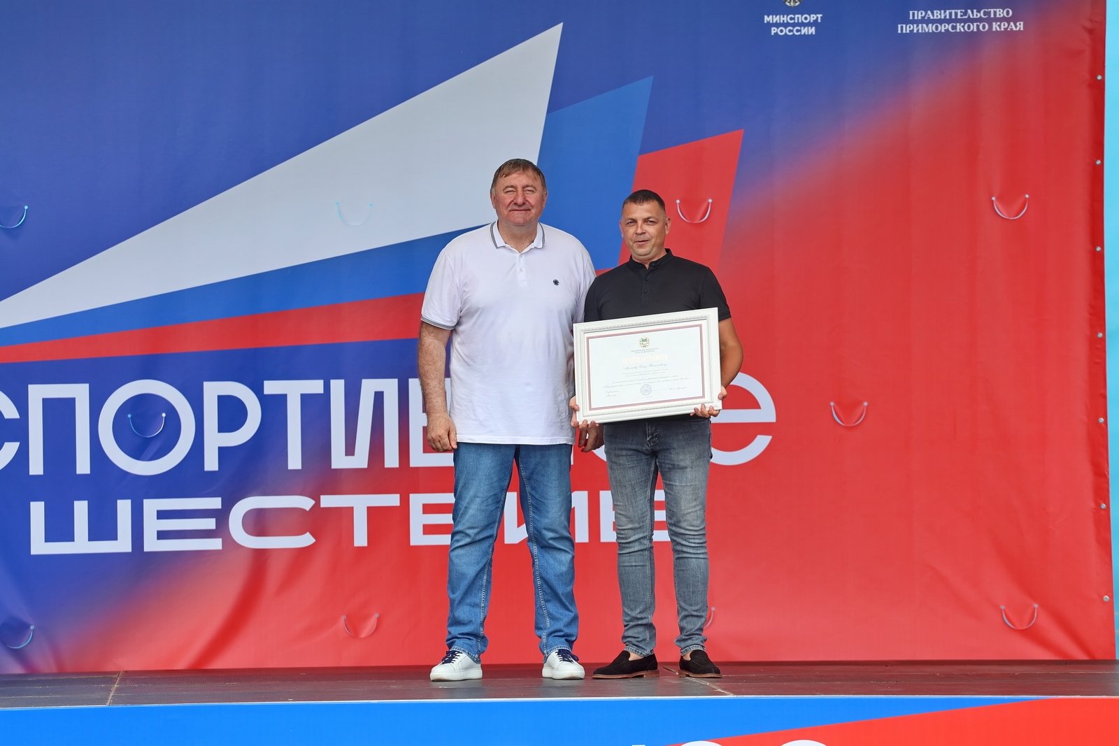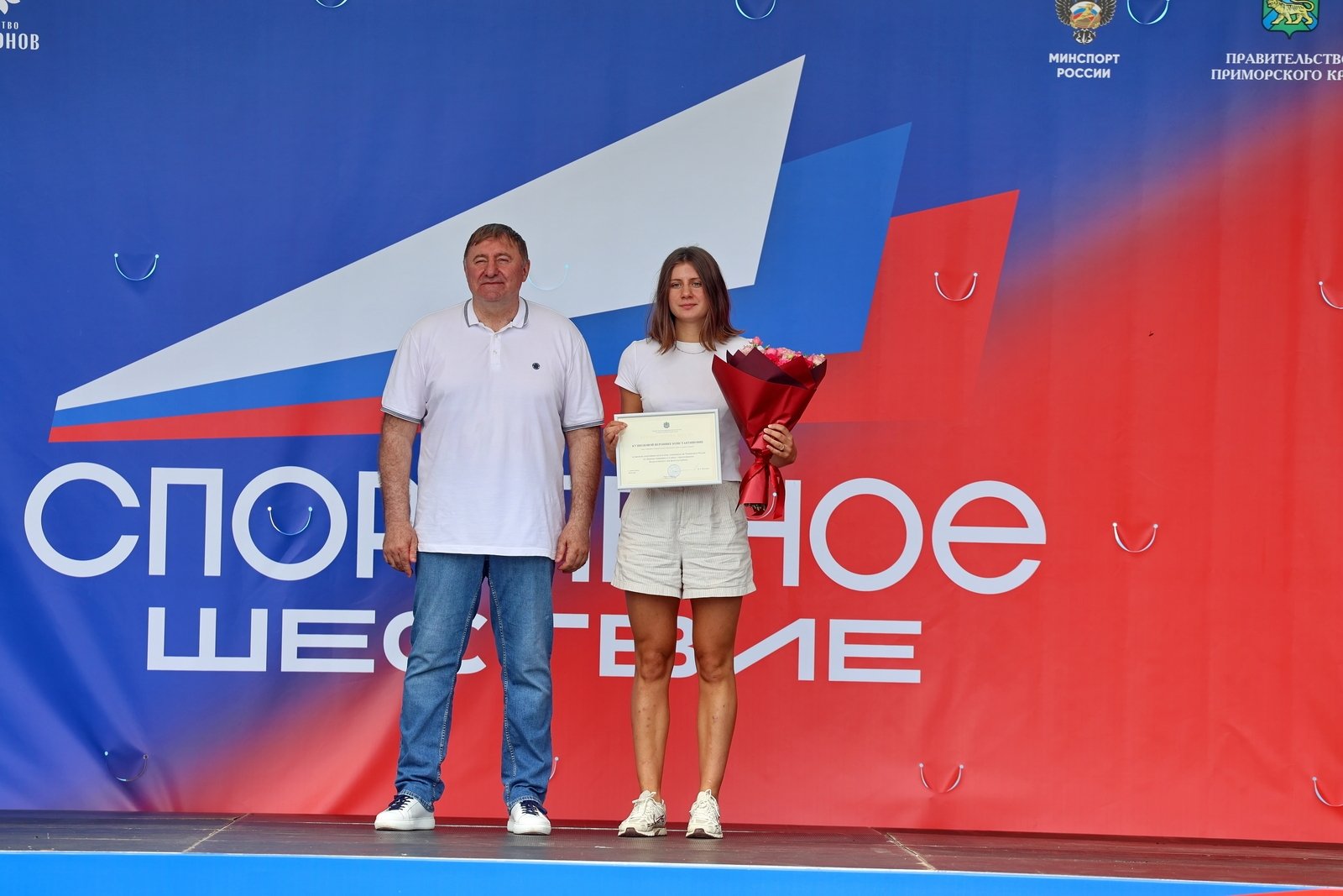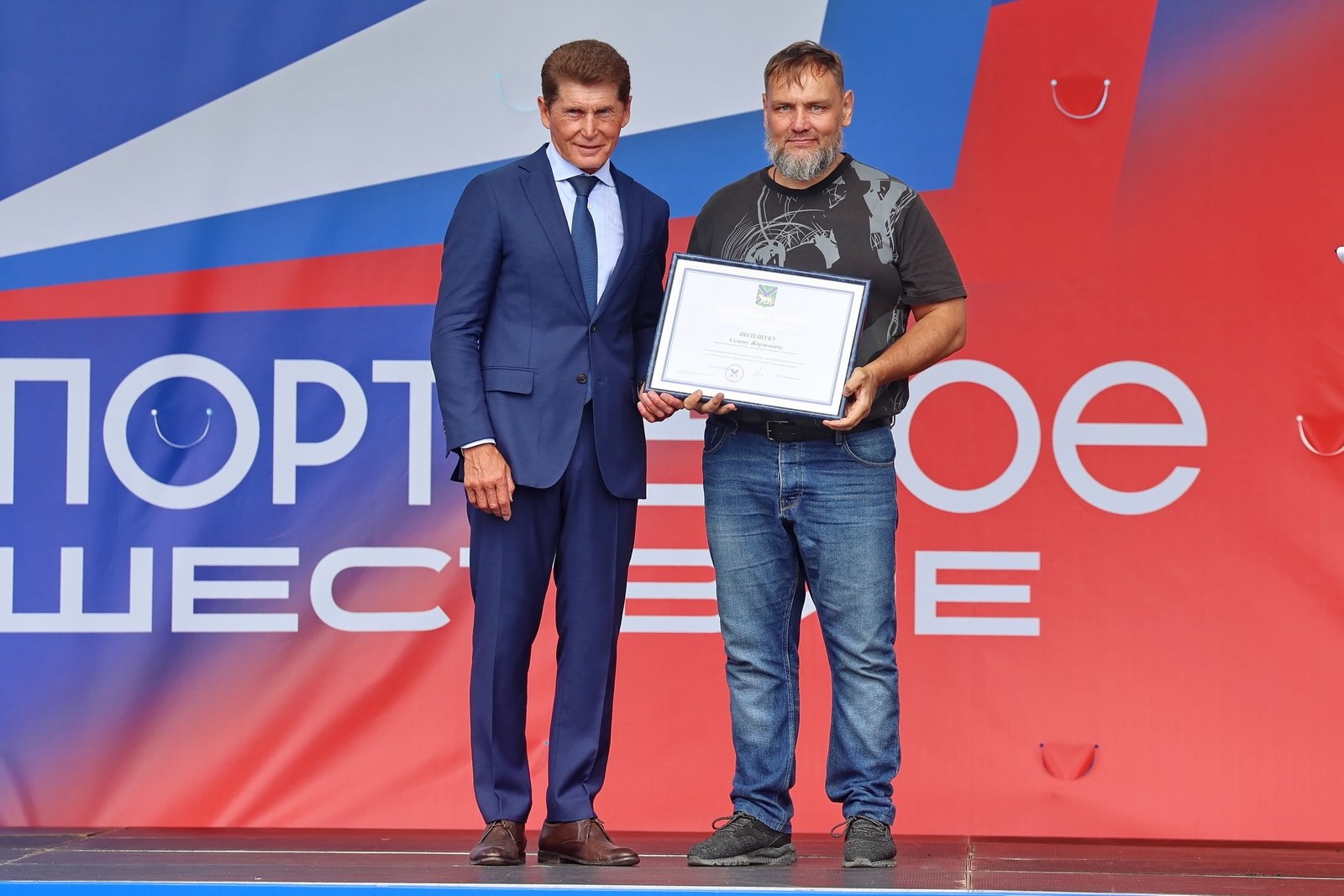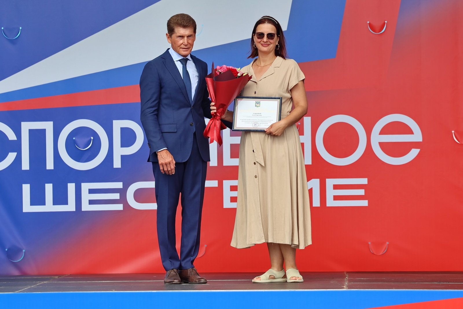 На сцене спортсменов приветствовал губернатор Приморского края Олег Кожемяко, глава Владивостока Константин Шестаков, министр физической культуры и спорта Приморья Жан Кузнецов. Все они вручили награды руководителям спортивных организаций, спортсменам и ветеранам спорта.