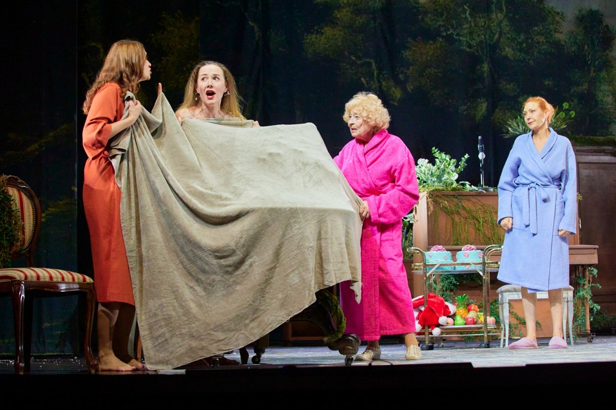 Теперь хочется кое-что добавить. Например, слова Ефима Звеняцкого о том, что такие пьесы — большая редкость для театров. Что греха таить, большинство пьес, которые ставились и ставятся в мире, рассчитано на мужчин. Тот же "Гамлет" (12+), например (спектакль по "Гамлету", кстати говоря, обещан театром в этом сезоне). Всего две женщины — Гертруда до Офелия, остальные — мужчины. А тут! Девять женщин и только четыре мужчины.