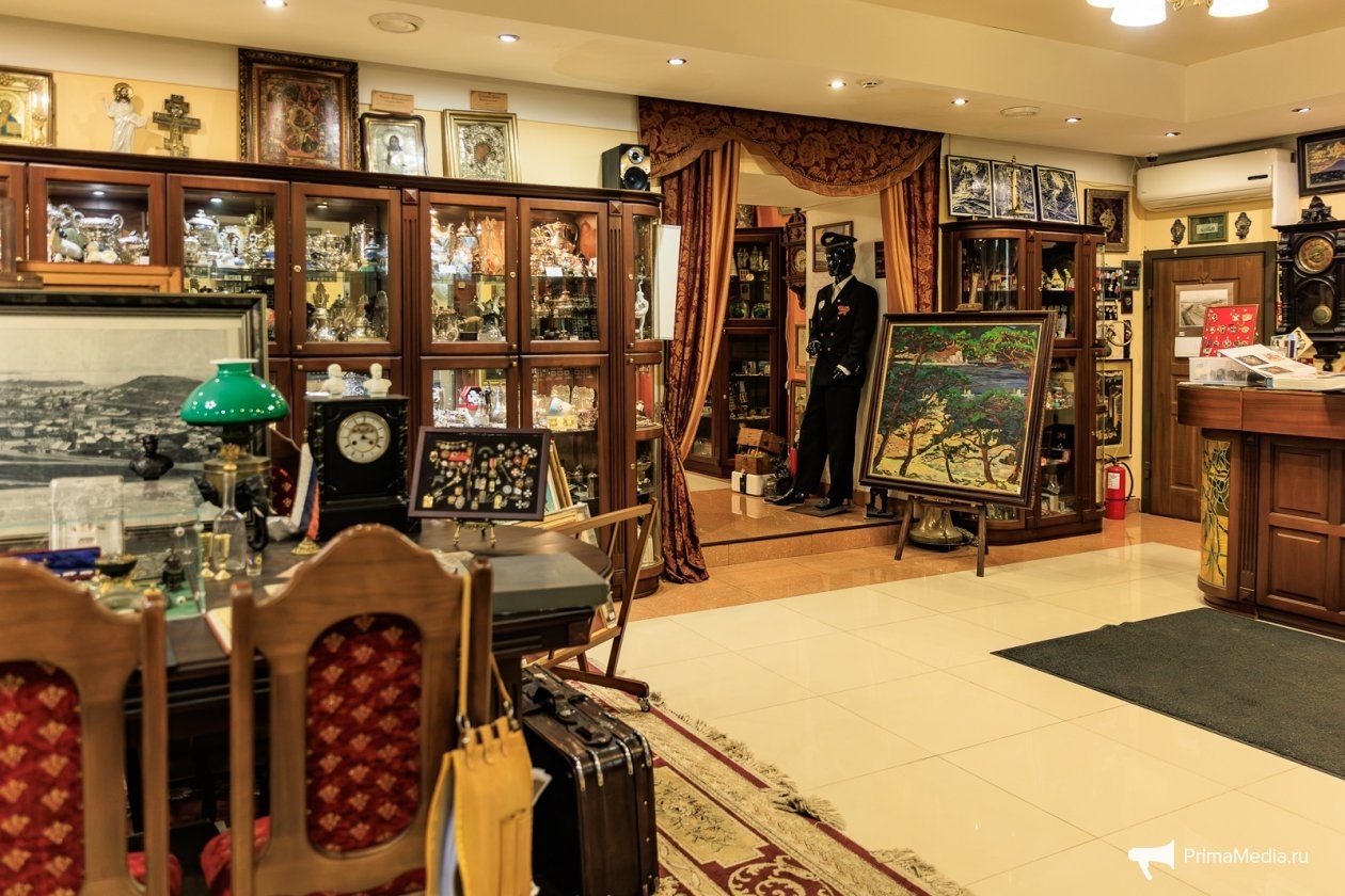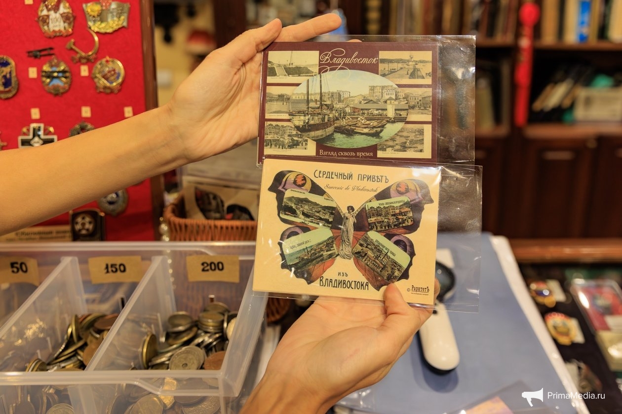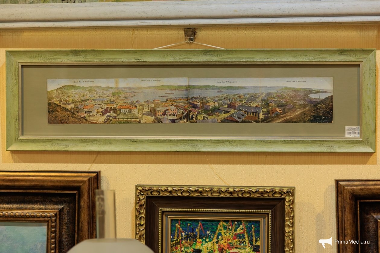 Живописи здесь отведён отдельный уголок. В Антикварной галерее собраны работы приморских художников, которые уже ушли из жизни, и потому каждая картина стала штрихом к портрету того Владивостока, которого мы больше не увидим. Среди авторов — Иван Рыбачук, Степан Арефин, Николай Жоголев, Владлен Камовский, Валерий Дружинин, Юрий Волков, Виктор Убираев и другие мастера, чья палитра стала частью культурной памяти региона. Среди артефактов, связанных с историей города и края, также фотографии военных моряков, служивших на Дальнем Востоке Российской империи, почтовые марки, этикетки и конверты с видами города.