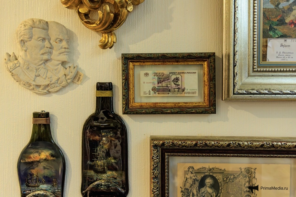 В галерее представлена внушительная коллекция фарфора — чашки, изящные фигуры, сервизы, в которых отражены вкусы разных эпох. Среди экспонатов также есть изделия Владивостокского фарфорового завода 1981–1991 годов. В отдельных альбомах множество монет со всего мира и бумажные банкноты, среди которых есть даже банкнотный рекордсмен — самый большой номинал из когда-либо существовавших. Особую ценность представляют денежные знаки времён Гражданской войны 1917–1922 годов и региональные выпуски до 1926 года. А рядом — удивительные бытовые свидетельства эпохи СССР: абонементы на питание в заводских столовых и талоны на хлеб.