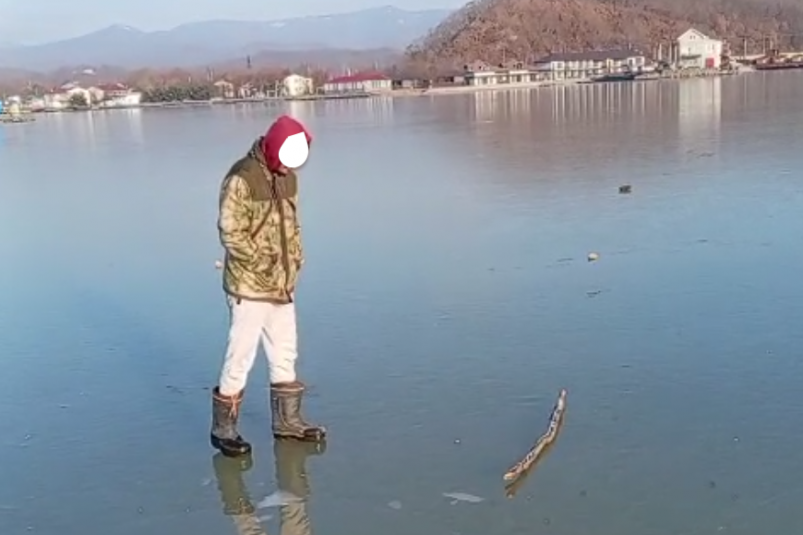 В социальных сетях появилось видео, как приморские рыбаки проверяют состояние первого льда на водоёмах.
