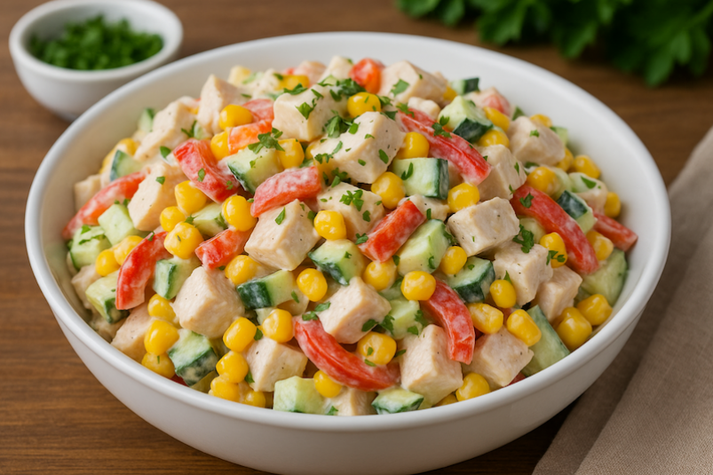Благодаря сочетанию сочного куриного филе, свежих овощей и легкого соуса салат получается неприлично вкусным. Ваши гости неизбежно попросят добавки.
