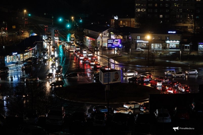 PrimaMedia, 27 ноября. Дневной дождь во Владивостоке сменился вечерним снегом с дождём. В разных районах города дежурит спецтехника, собрались пробки.