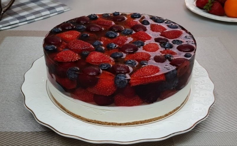 Когда верх полностью застынет, аккуратно снять форму и плёнку. Ягодный торт держит форму, выглядит ярко и станет эффектным украшением вашего стола.