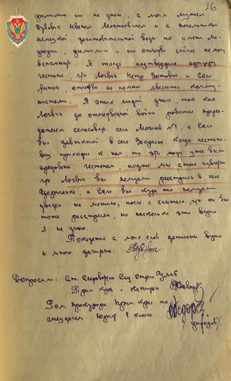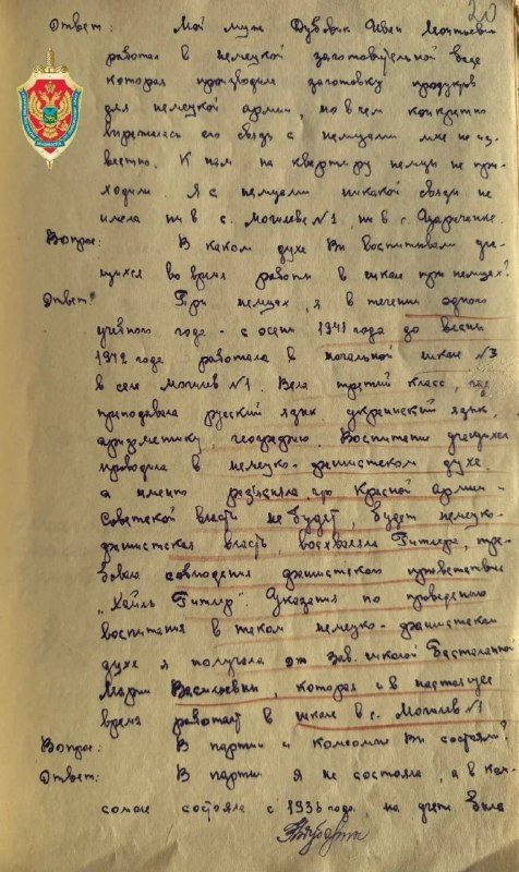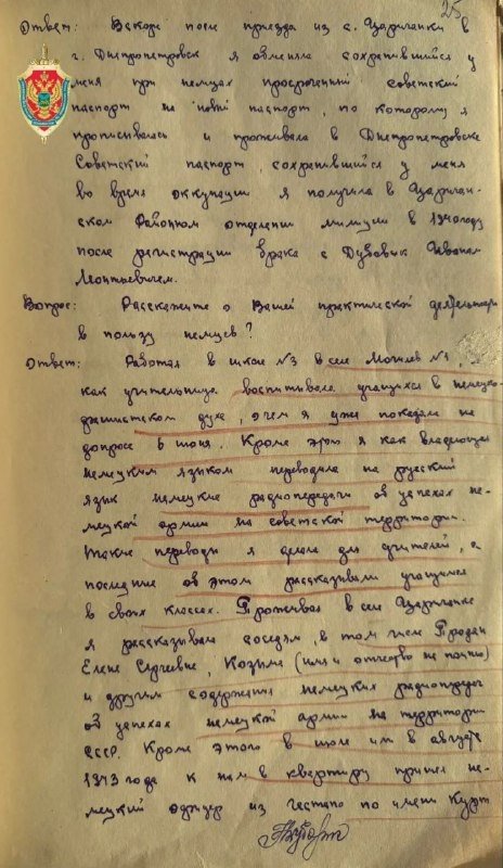 "С осени 1941 года до весны 1942 года работала в начальной школе Nº 3 в селе Могилев Nº1. Вела третий класс, где преподавала русский язык, украинский язык, арифметику, географию. Воспитание учеников проводила в немецко-фашистском духе, а именно, разъясняла про Красную армию — советской власти не будет, будет немецко-фашистская власть, восхваляла Гитлера, требовала соблюдения фашистского приветствия "Хайль Гитлер"", — говорится в показаниях женщины.