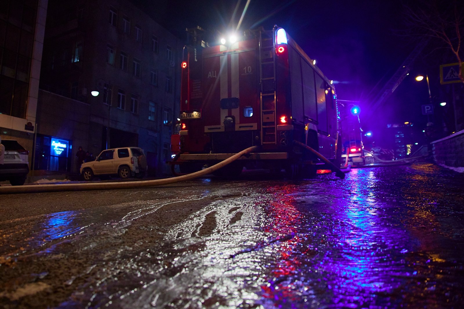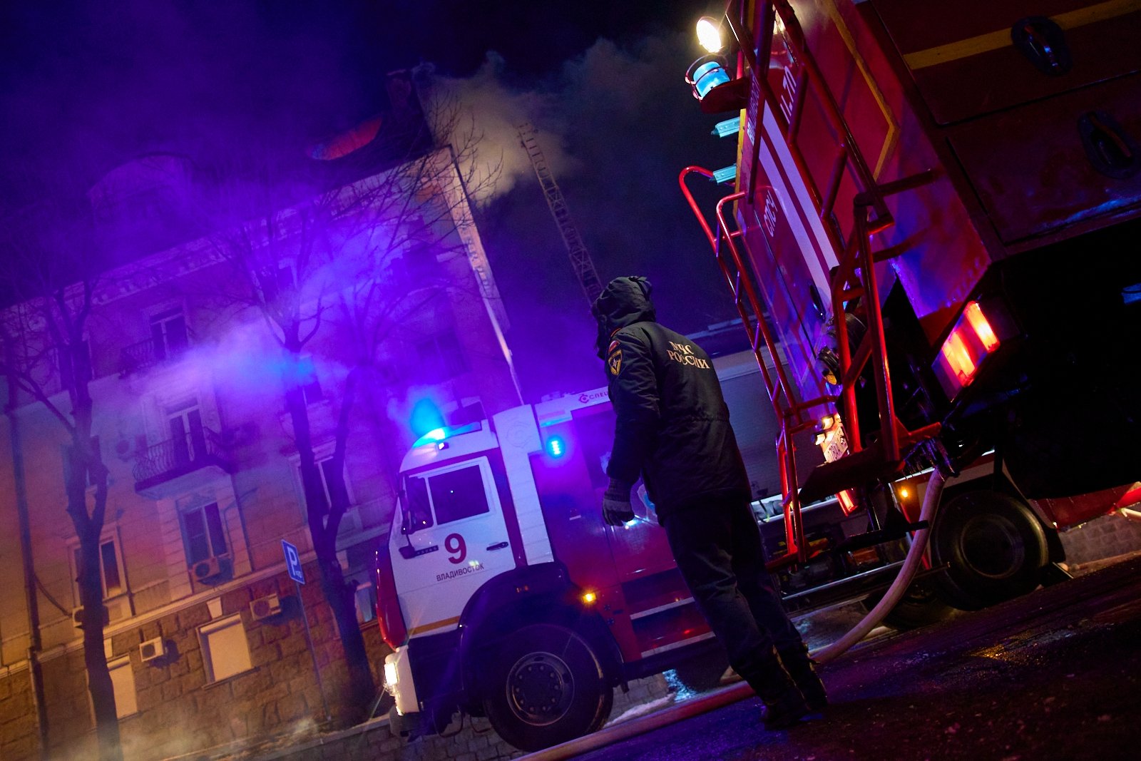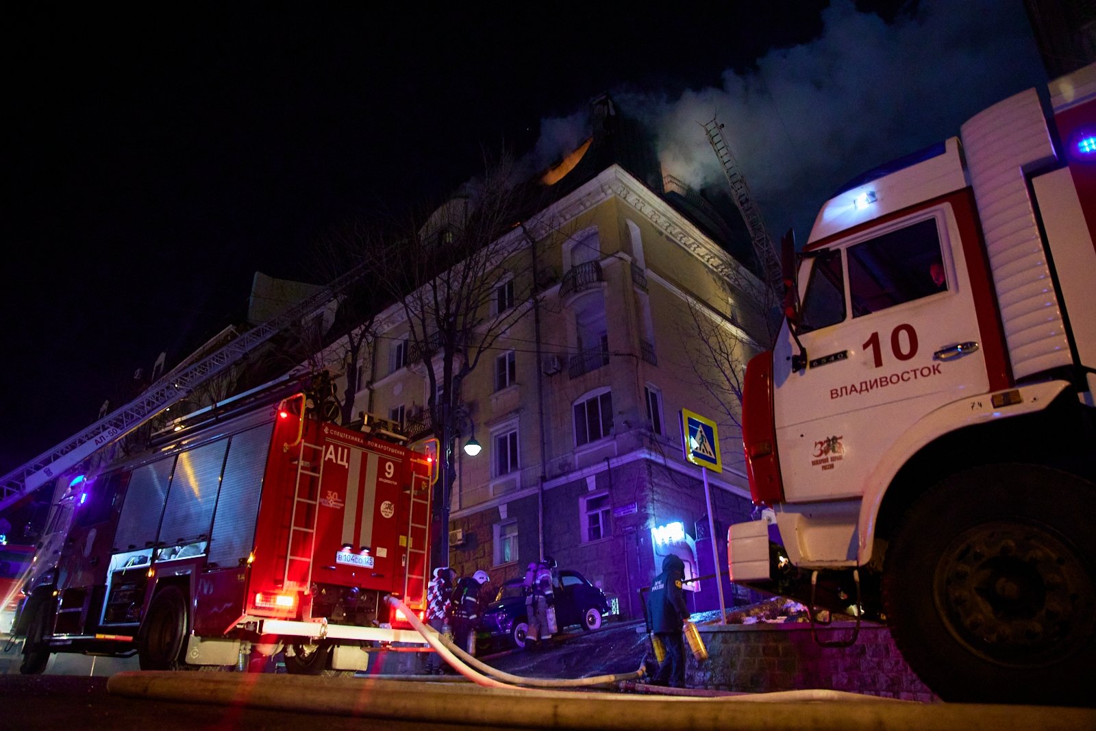 Больше двух часов огнеборцы МЧС России ликвидируют пожар в центре Владивостока Огнём охвачено правое крыло мансардного этажа на площади 400 кв. метров