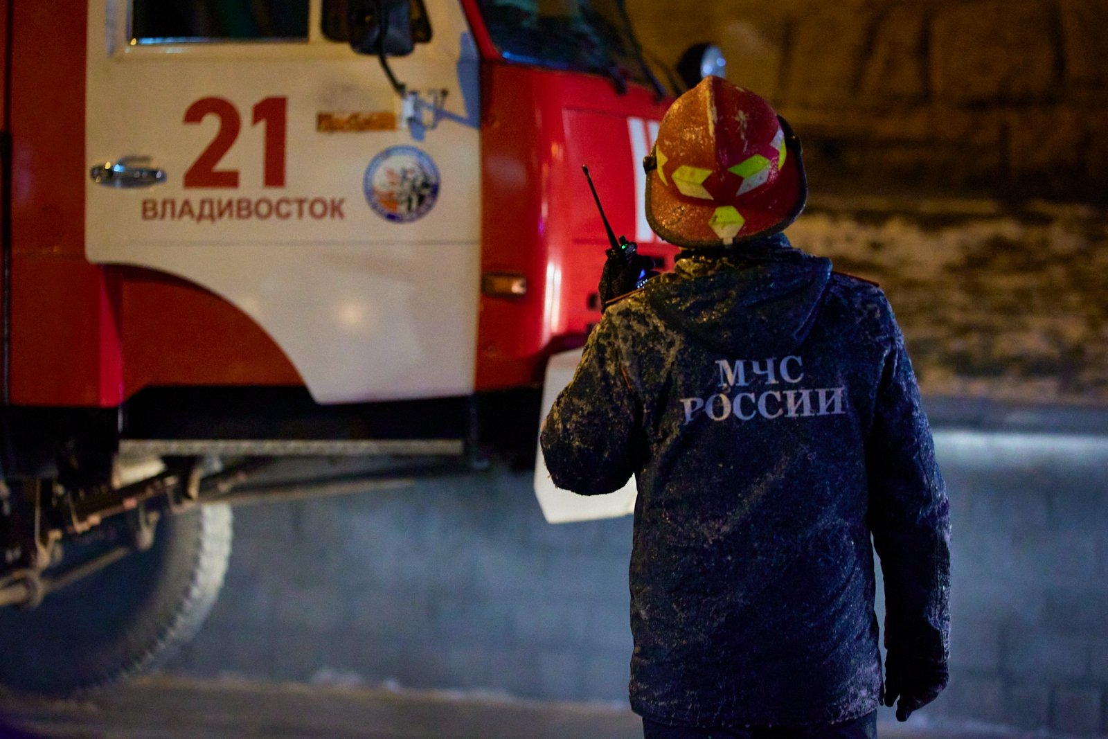 Огнеборцы, полиция, медики работают на месте пожара в многоквартирном доме во Владивостоке