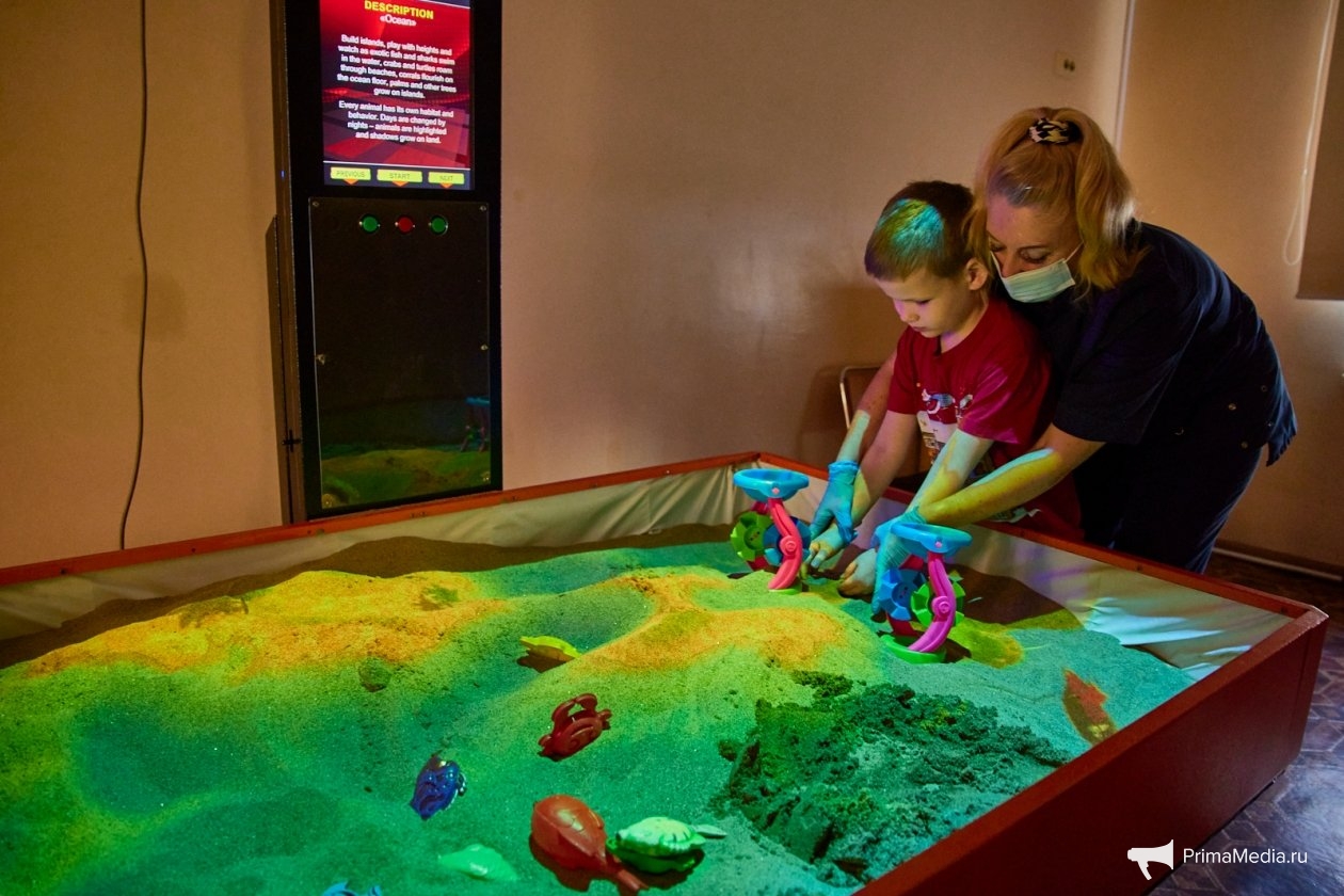 В соседнем кабинете интересы детей развивают в игровой форме с помощью интерактивной песочницы. На неё проецируются различные изображения, с которыми дети взаимодействуют: учат цвета, развивают внимание и координацию, строят фигуры. Педагог-психолог Елена Марченко отмечает, что такой динамичный формат идеально подходит для детей с неврологическими нарушениями, которым трудно долго сидеть на одном месте. Играя, они с удовольствием выполняют задания, а изменение ландшафта в песочнице позволяет моделировать разные ситуации — например, учить правилам поведения при пожаре.
