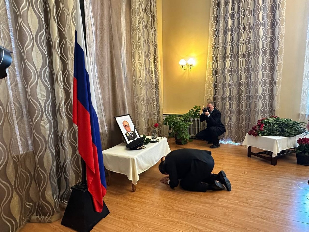 На фотографиях, которые разместили ЦТАК, а также ТГ-канал посольства России в КНДР, северокорейский лидер преклоняет колено перед портретом ушедшего из жизни Александра Мацегоры.