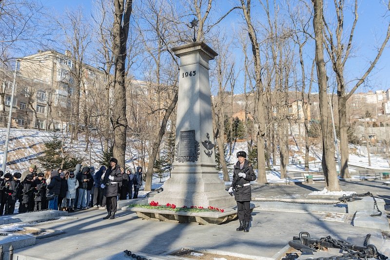Памятное мероприятие во Владивостоке в этом году традиционно прошло в Гайдамакском сквере, где расположена Братская могила моряков Тихоокеанского флота, погибших в боях с японскими милитаристами. Напомним, в 1945 году в боевых операциях моряки-тихоокеанцы проявили чудеса храбрости и героизма. Тысячи из них были удостоены правительственных наград, 52 воинам-тихоокеанцам присвоено звание Героя Советского Союза. В ожесточённых боях с японцами многие моряки пали смертью храбрых. В сентябре 1945 года из мест боёв во Владивосток были доставлены останки восьми неопознанных моряков-десантников и 30 сентября торжественно захоронены в братской могиле. Над могилой установлен обелиск, сооружённый по проекту архитектора М. С. Смирнова.
