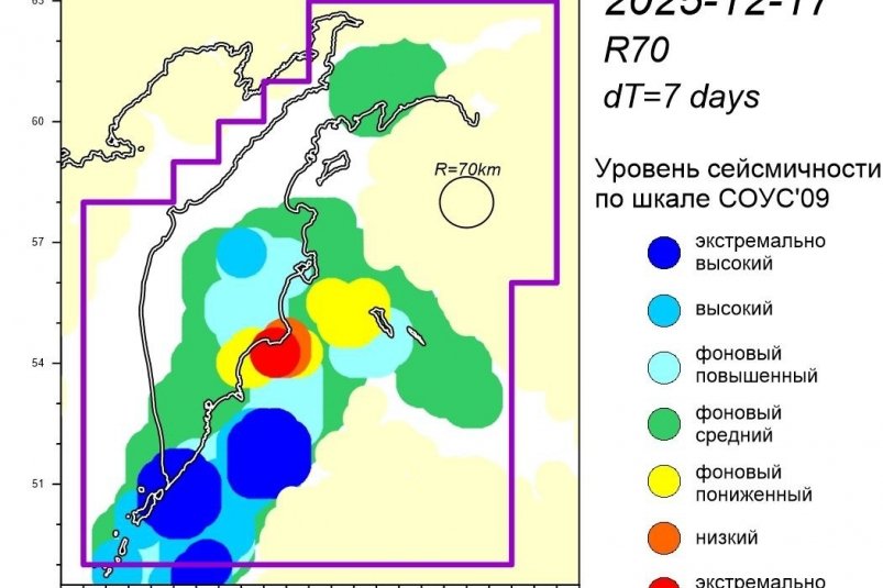 Уровень сейсмичности Камчатского участка зоны субдукции опять вырос. По состоянию на 17 декабря он определяется, как высокий (по шкале СОУС"09). На прошлой неделе уровень сейсмичности был несколько ниже — его определяли, как фоновый повышенный. Однако сейчас уровень сейсмичности всё же ниже, чем был в начале ноября, тогда он характеризовался, как экстремально высокий (таким он был на протяжение долгого времени после мощного июльского землетрясения.