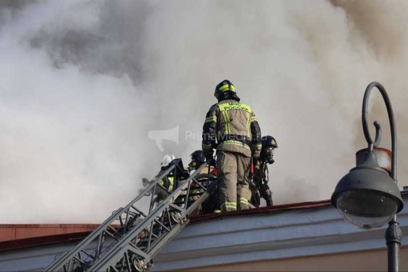 Пожар в центре Владивостока вспыхнул с новой силой: усилился дым, появились языки пламени. Пожарные распиливают железную крышу, чтобы добраться до очага возгорания.