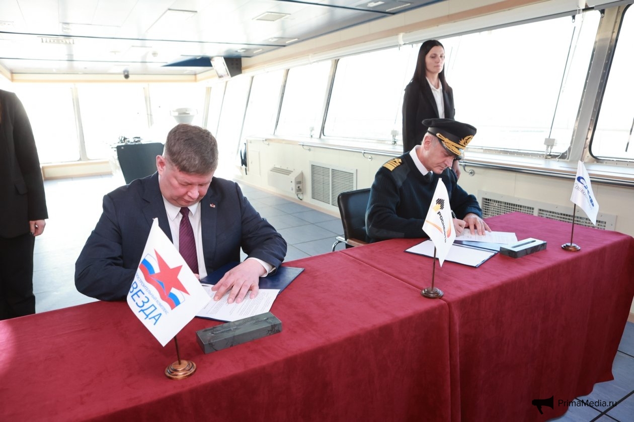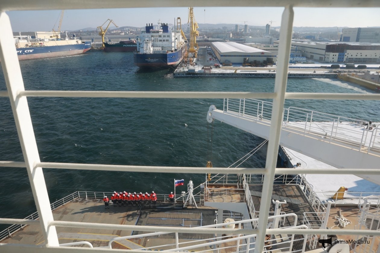 PrimaMedia, 24 декабря. На судоверфи "Звезда" в Большом Камне состоялась торжественная церемония передачи первого в России ледокольного газовоза для сжиженного природного газа "Алексей Косыгин". Судно, построенное для ПАО "Совкомфлот", станет головным в серии, создаваемой в рамках проекта "Арктик СПГ-2".