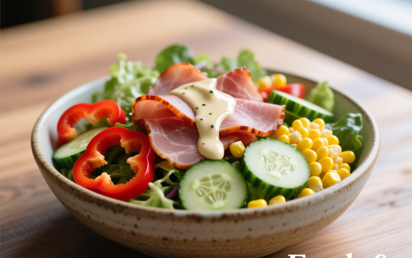 - Нарежьте яйца мелко, ветчину соломкой, перец полосками, огурец тонкими дольками, добавьте кукурузу и перемешайте.