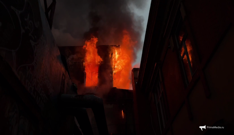 Обновлено 10.31: При тушении прорвало пожарный рукав, сообщает корр. ИА PrimaMedia с места событий, но проблему оперативно устранили. Всё ещё наблюдаются открытые участки горения, пожар пока не ликвидирован. Спасатели говорят о том, что возможно повторное обрушение крыши.