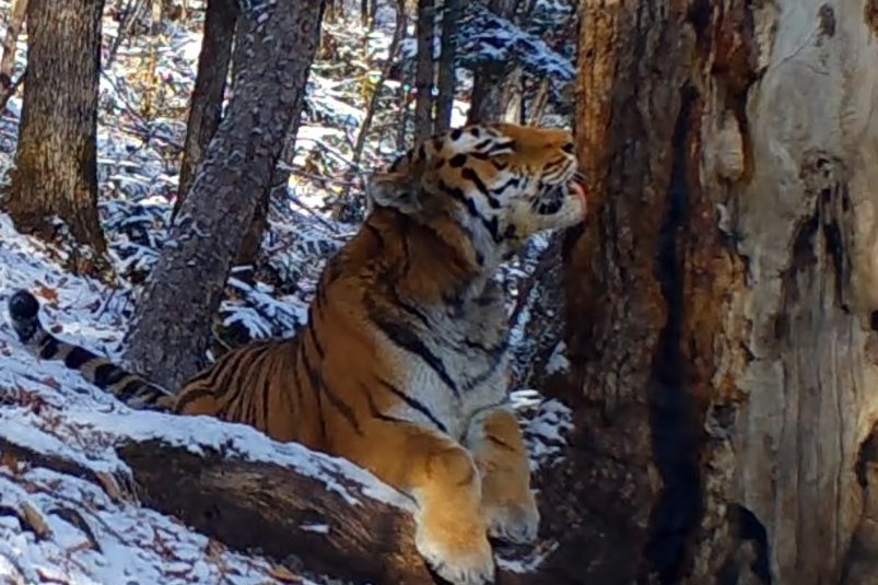 PrimaMedia, 5 января. В национальном парке "Земля леопарда" фотоловушка запечатлела необычное поведение амурского тигра — хищник проявил настоящую "нежность" к вековой пихте цельнолистной. Самец под номером T18M подошёл к дереву, тщательно понюхал ствол, а затем начал вылизывать кору и тереться о неё щеками, сообщила пресс-служба нацпарка.