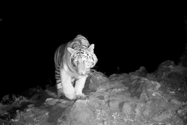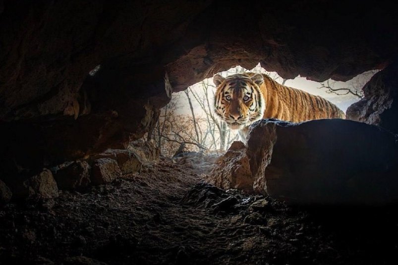 Камера фотографа дикой природы, установленная в одной из пещер на юге Приморья, сняла амурского тигра с необычного ракурса. Удивленное выражение морды словно показывает, что хищник ожидал чего-то другого, когда посмотрел в пещеру. Животное явно растерялось.