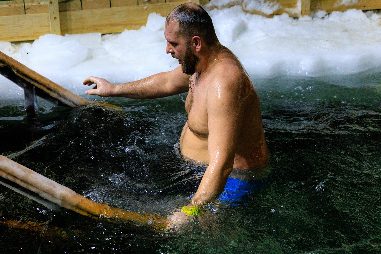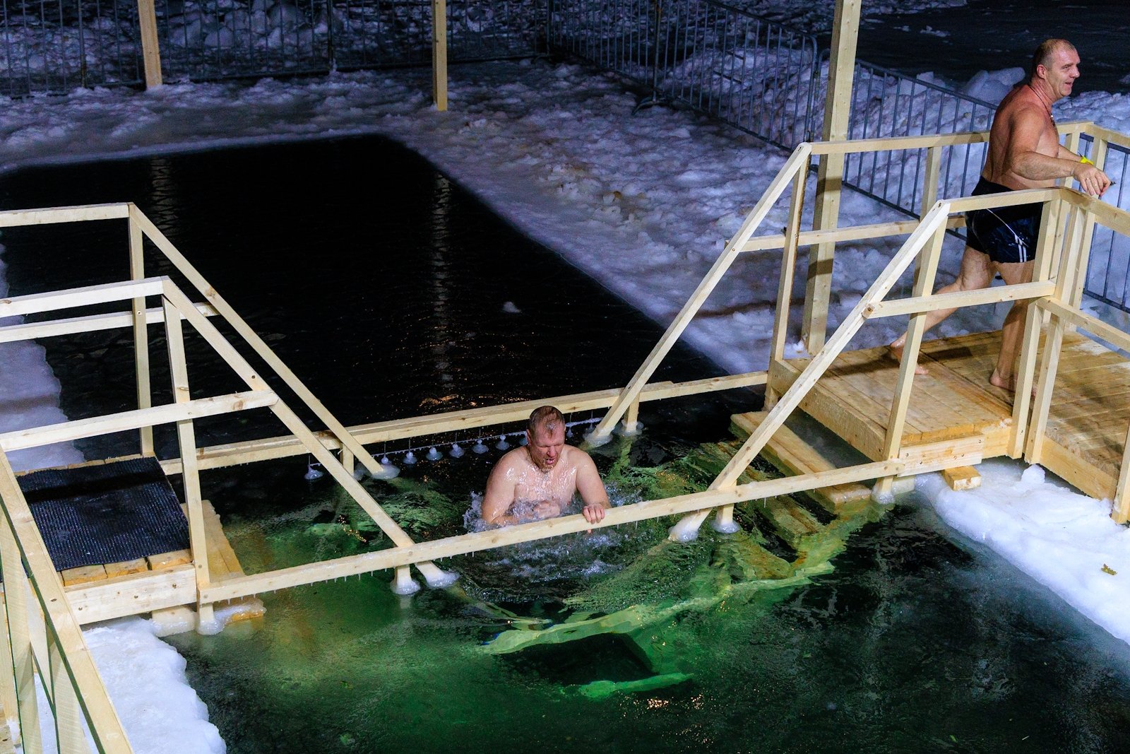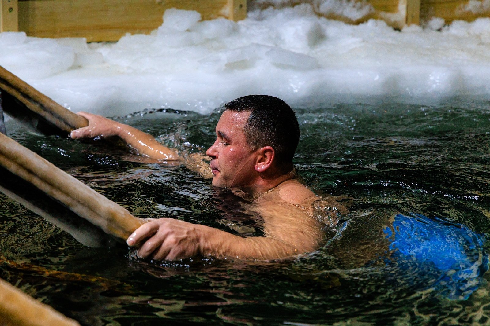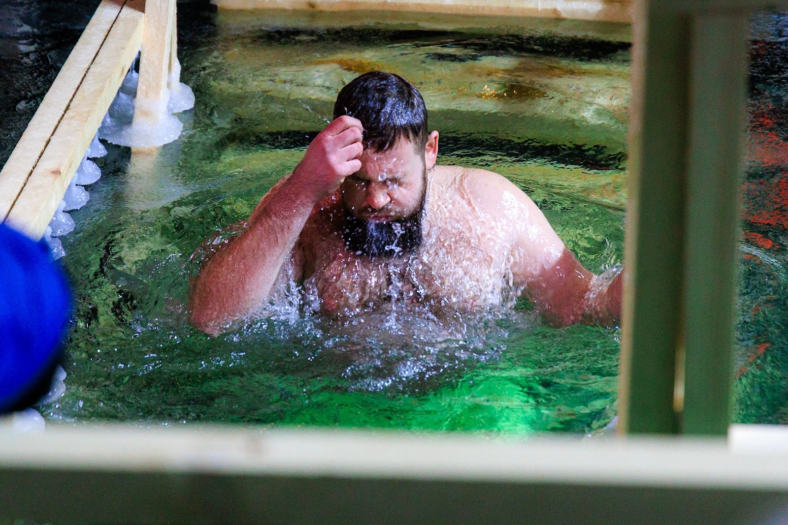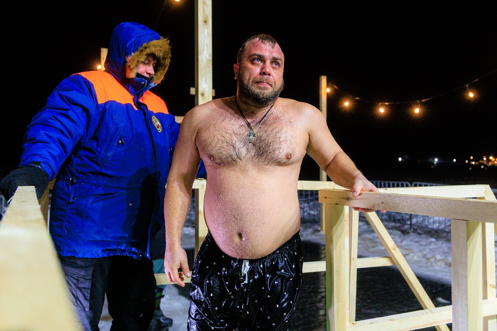 Несмотря на то что людей было немного, купель не пустовала — люди сменяли друг друга в спокойной атмосфере, без суеты и толчеи. Для многих, как для Виктора Пахмутова, это была привычная практика закаливания и он на удивление всех собравшихся провел в купели несколько минут.