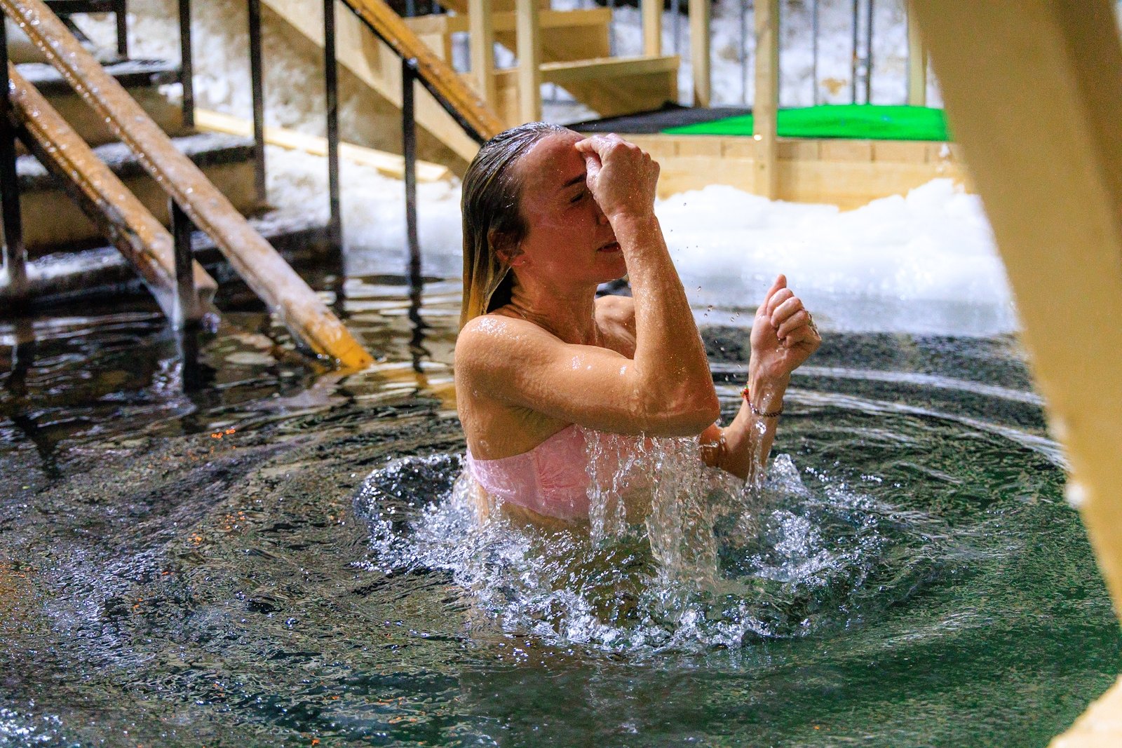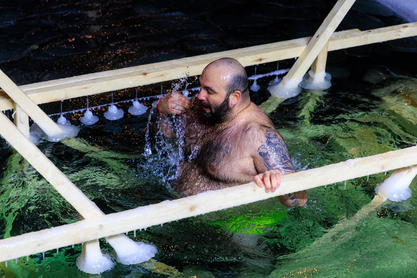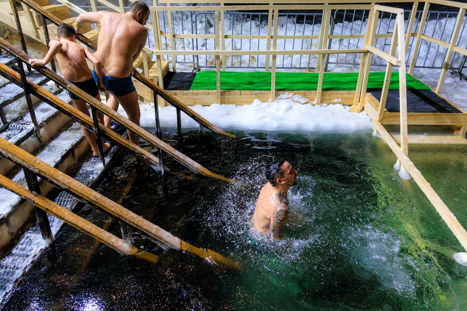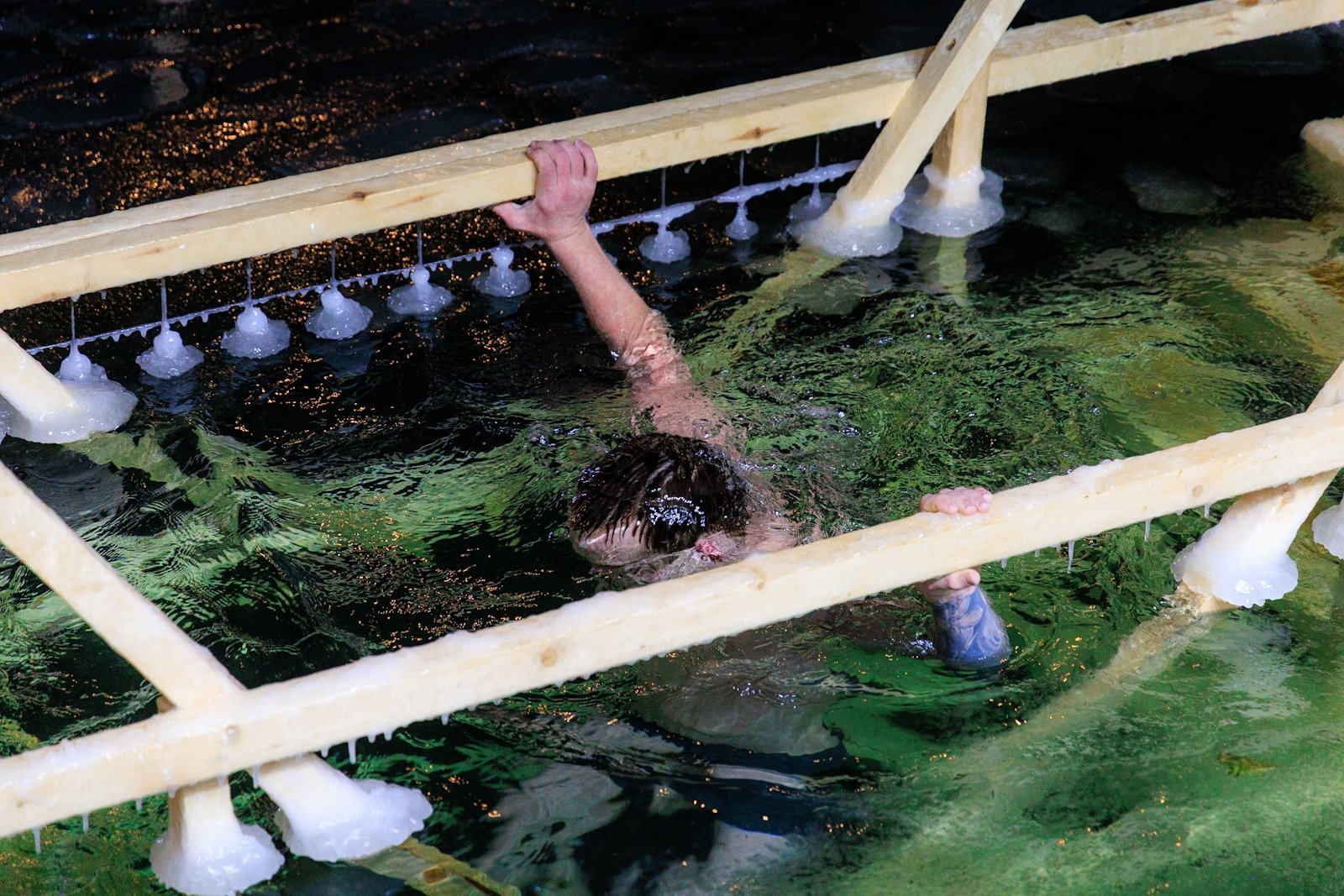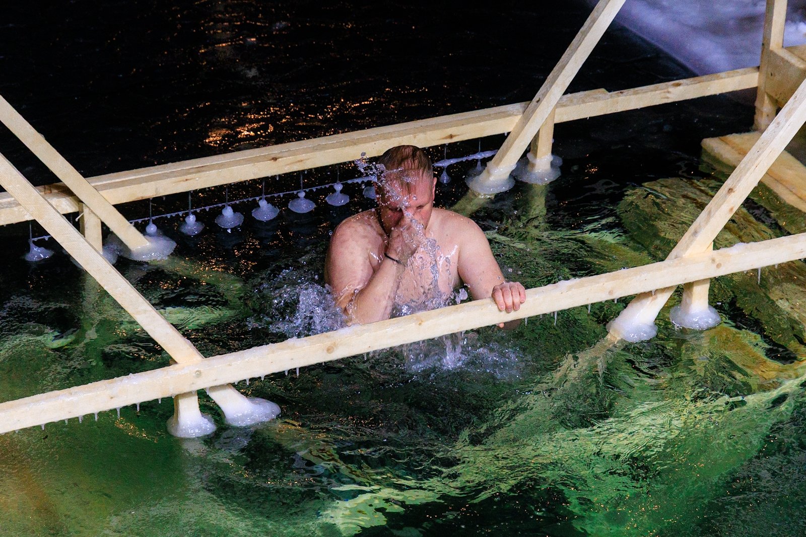 Несмотря на то что людей было немного, купель не пустовала — люди сменяли друг друга в спокойной атмосфере, без суеты и толчеи. Для многих, как для Виктора Пахмутова, это была привычная практика закаливания и он на удивление всех собравшихся провел в купели несколько минут.