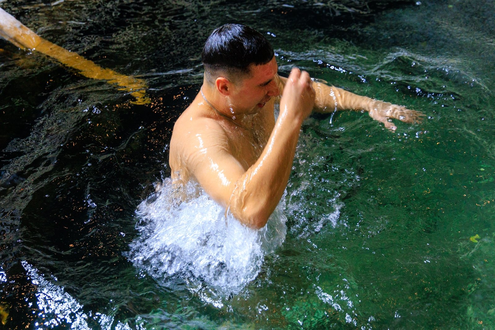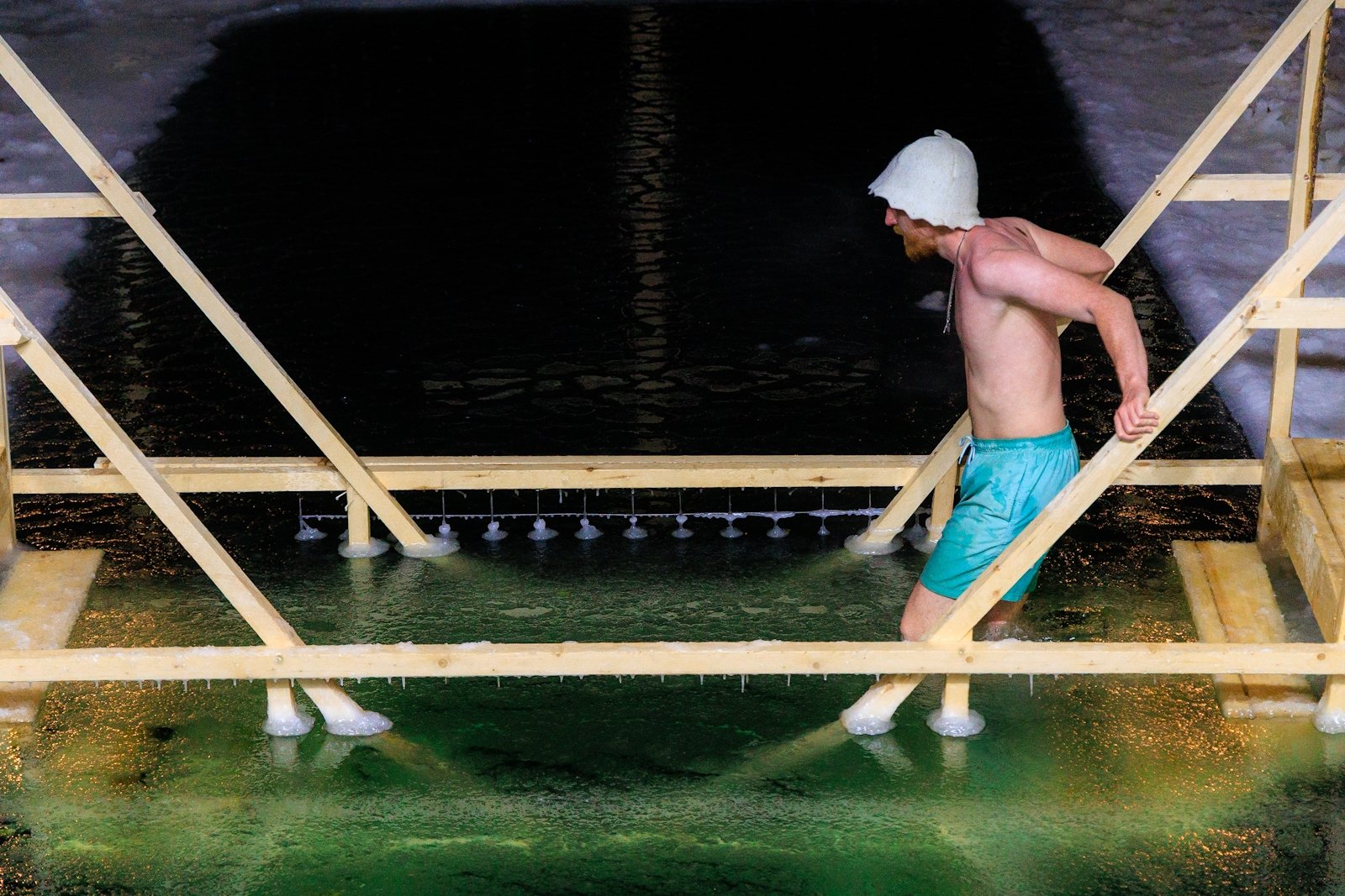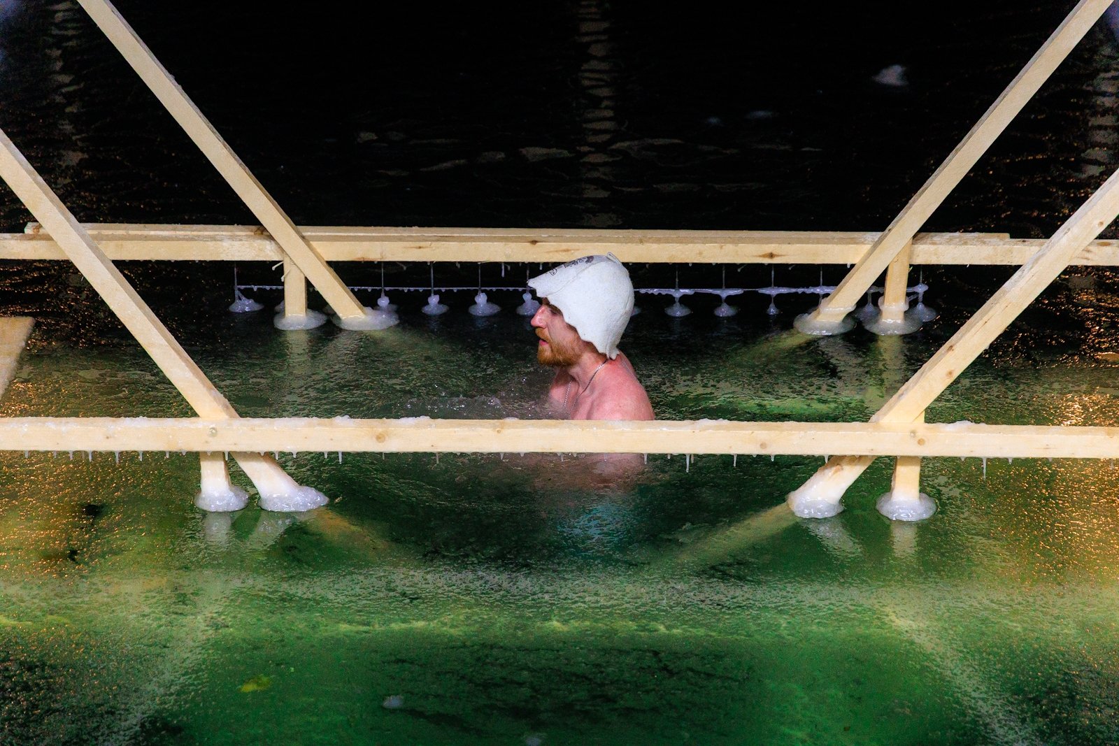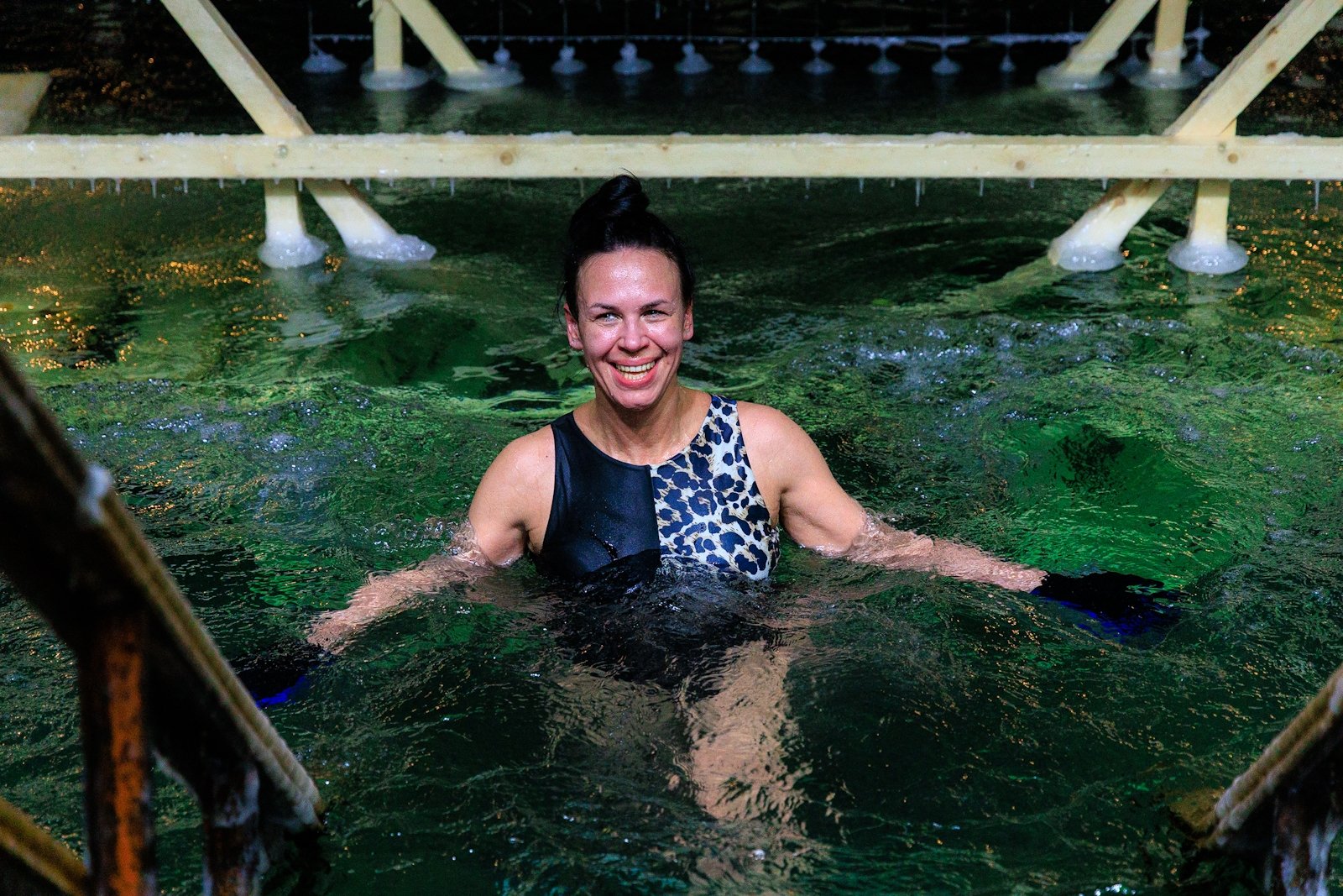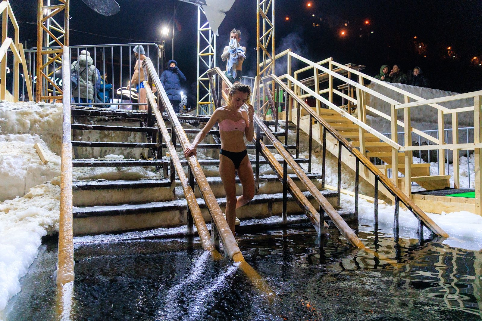 Несмотря на то что людей было немного, купель не пустовала — люди сменяли друг друга в спокойной атмосфере, без суеты и толчеи. Для многих, как для Виктора Пахмутова, это была привычная практика закаливания и он на удивление всех собравшихся провел в купели несколько минут.