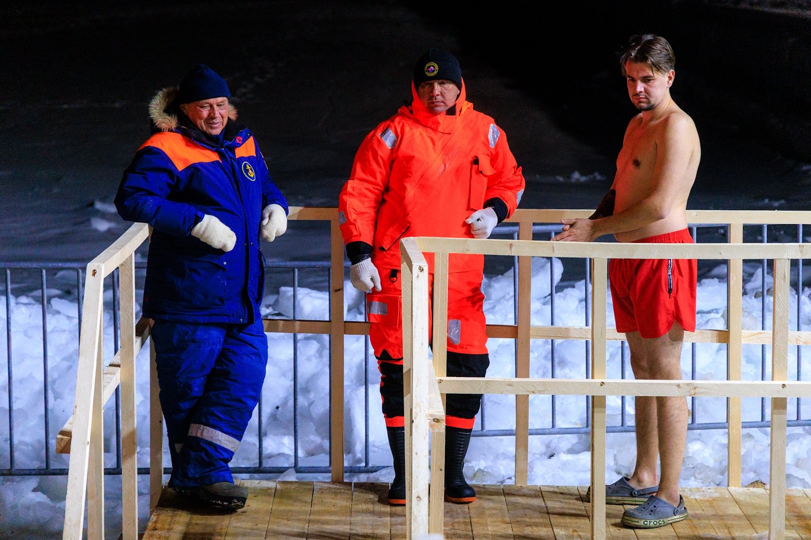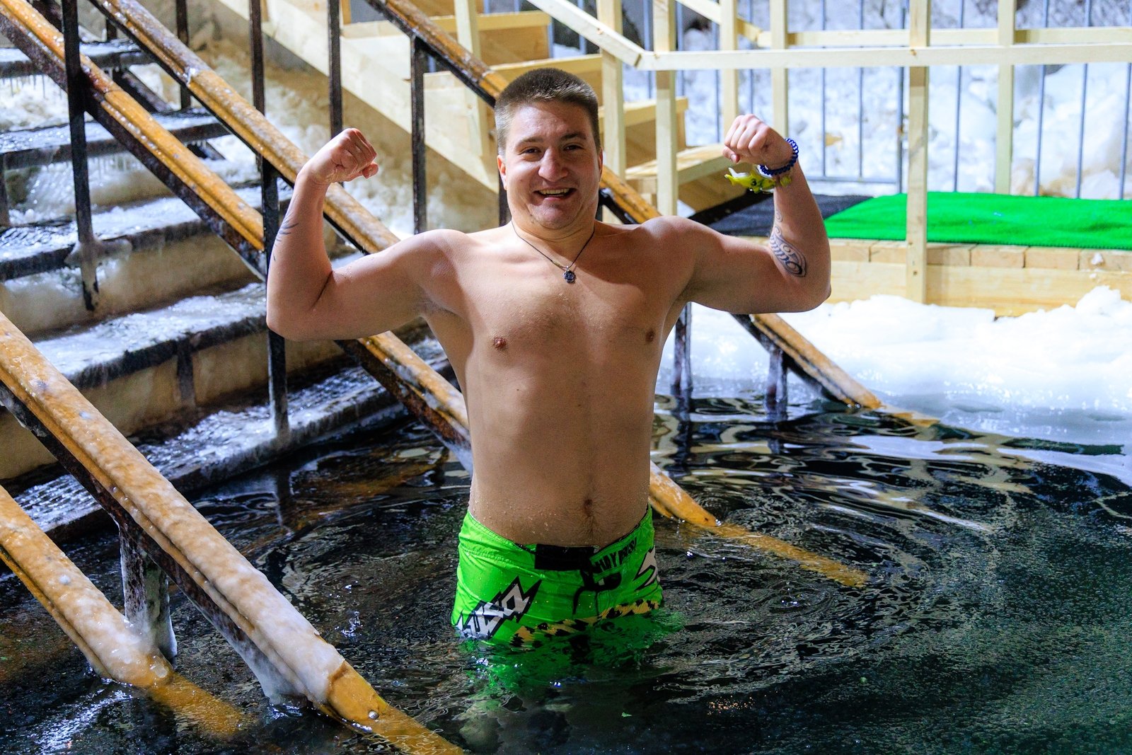 "Хорошее настроение, воодушевление — самые положительные эмоции. Я занимаюсь закаливанием, сюда хожу два раза в неделю. Сегодня потеплее, чем обычно — хорошая, комфортная вода", — поделился он.