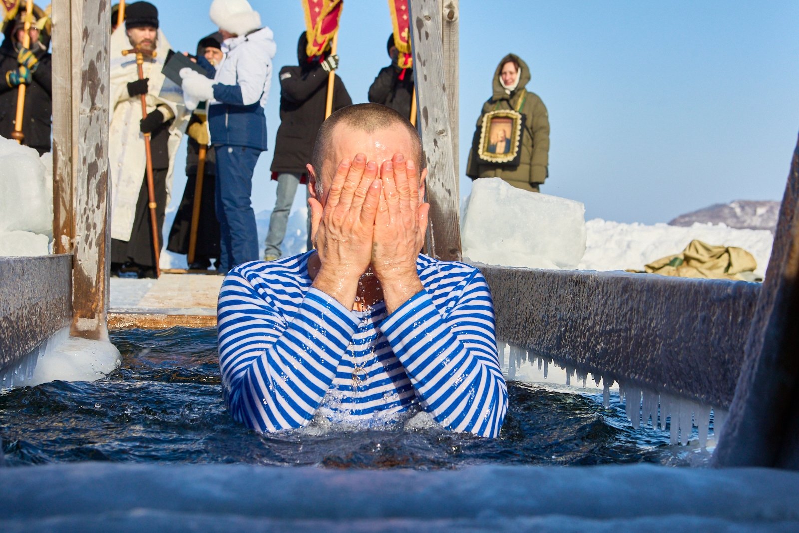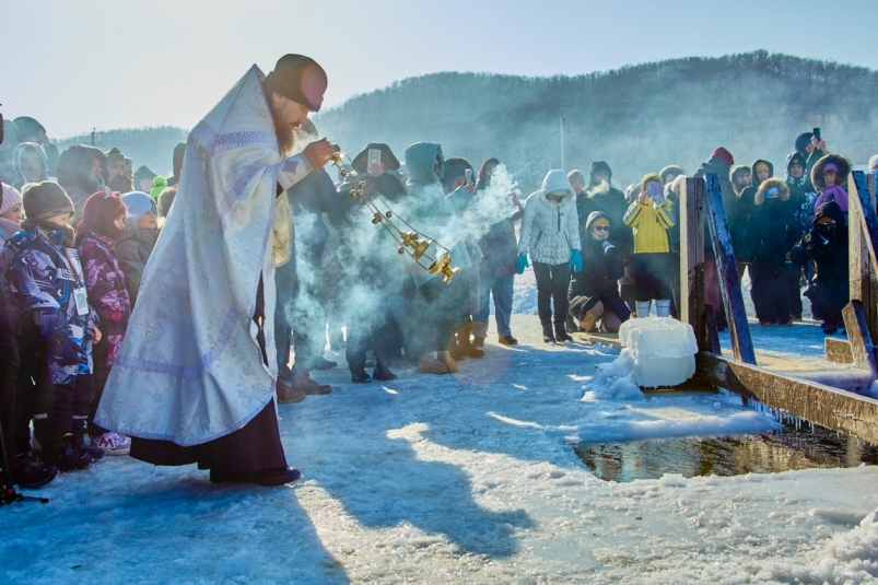 Крещенский мороз не стал преградой для жителей Владивостока — десятки горожан приехали на остров, чтобы поучаствовать в Крестном ходе и присоединиться к окунаниям в прорубь — важному обряду, несущему глубокий духовный смысл и одновременно объединяющую культурную глубину. В каком-то смысле это и испытание духа и тела, требующее решимости. Чтобы оно оказалось не только одухотворяющим, но и безопасным, на месте дежурили сотрудники МЧС.