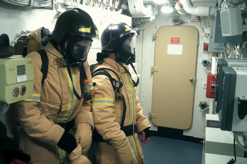 Но вернёмся к тренировке. Личный состав аварийной партии под руководством командира электромеханической боевой части капитан-лейтенанта Максима Рогова прибыл на свои места. Бойцы, задействованные в ликвидации "пожара", в кратчайшие сроки надели пожарные костюмы. Алгоритм действий в подобной ситуации на корабле отработан до автоматизма. К аварийному помещению направляются разведчики, чтобы на месте определить объёмы повреждений, оценить обстановку и выбрать средства для ликвидации пожара.