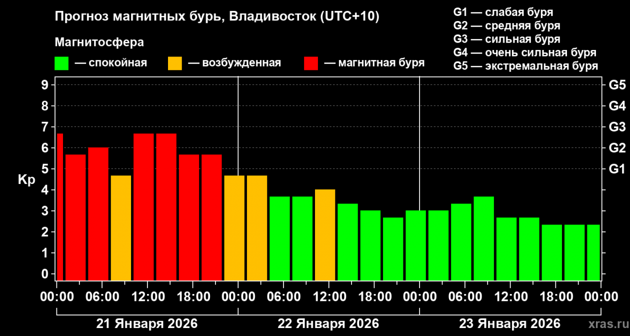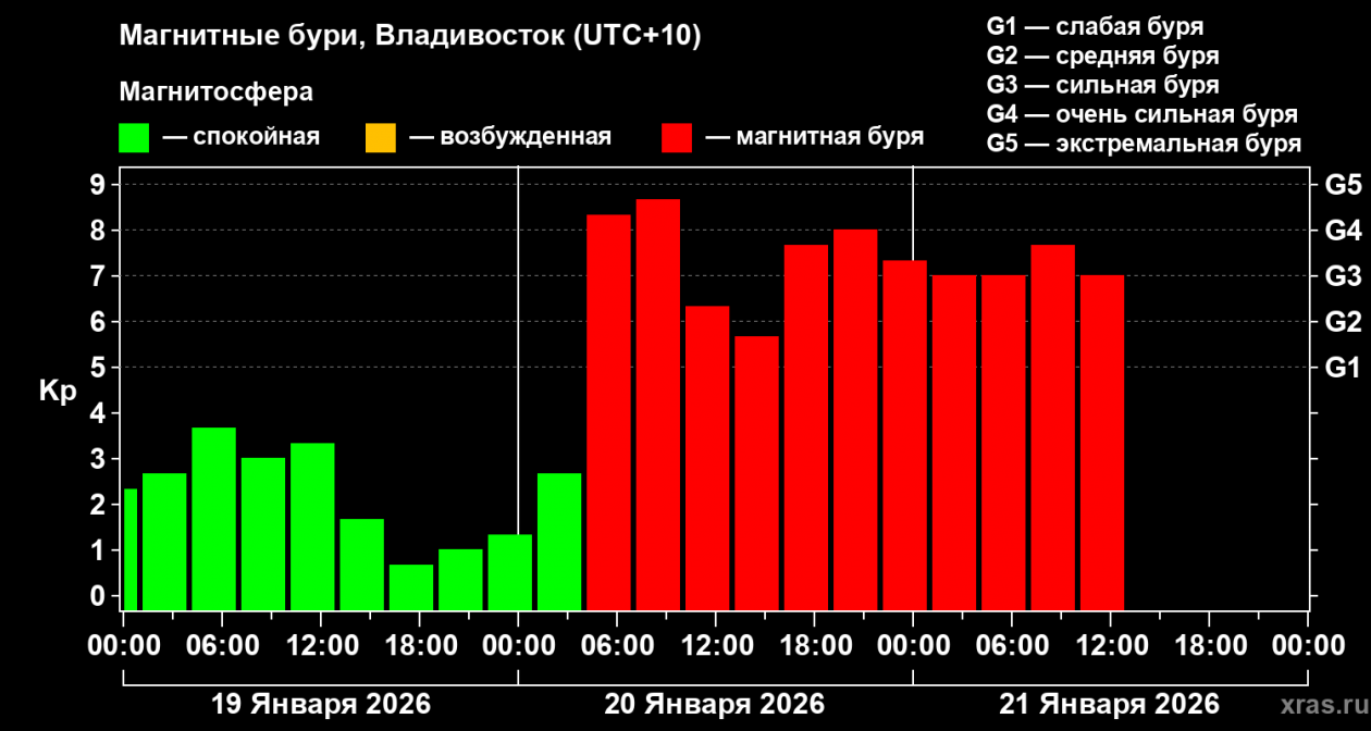 Под занавес месяца ожидается двухдневная магнитная буря, которая придется на 26 и 27 января. Ее сила не превысит пяти баллов.