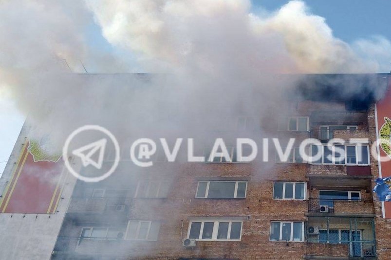 В результате возгорания были выбиты окна, балкон полностью почернел от огня и дыма. На место прибыли не менее трёх пожарных бригад и автомобиль скорой помощи. Фото опубликовал tg-канал "smi25" (18+).