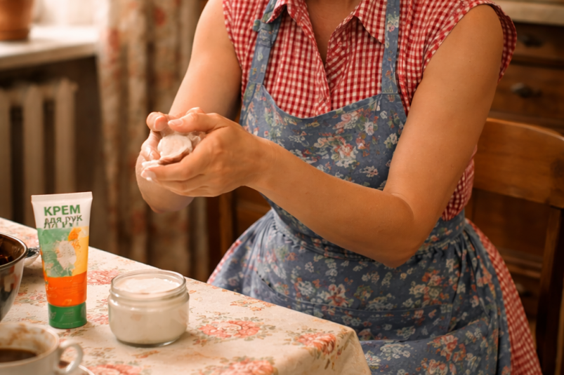 - Средство втирали тщательно, но без избытка, уделяя особое внимание костяшкам пальцев, зоне вокруг ногтей, локтям и участкам над суставами. Считалось, что мягкая и эластичная кожа в этих местах снижает ощущение стянутости и дискомфорта при движении.