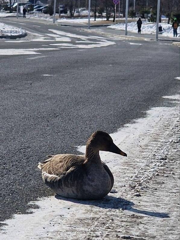 Студенты Дальневосточного федерального университета заметили на территории кампуса необычного "гостя". По дороге на занятия на острове Русский по университетским дорожкам спокойно разгуливал гусь.