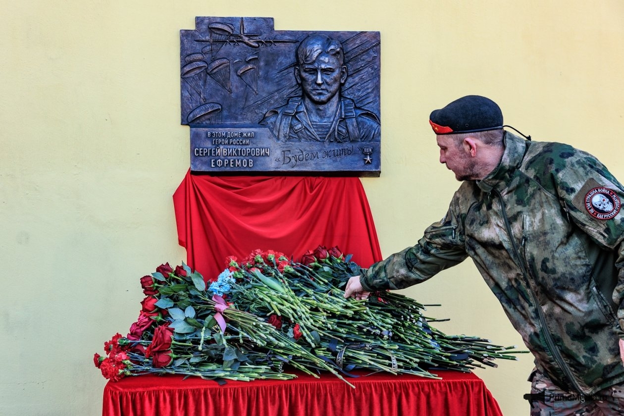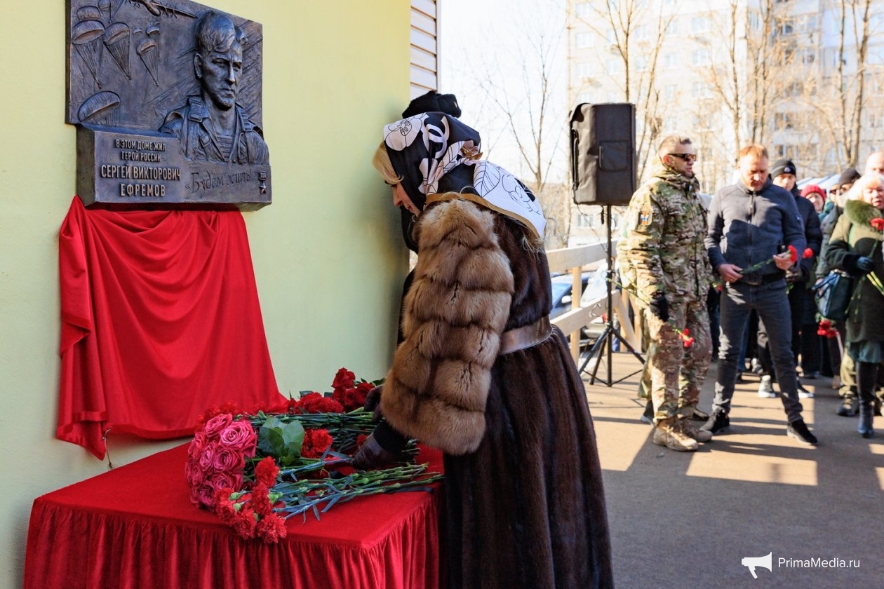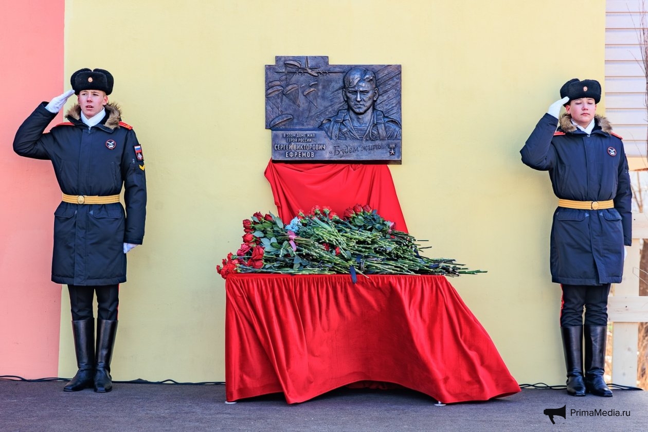 PrimaMedia, 2 февраля. В первую годовщину гибели Героя России, полковника Сергея Ефремова, на фасаде его родного дома № 1 по ул. Терешковой открыли мемориальную доску. Вместе с родными и сослуживцами, которые называли его "батей", память командира почтили губернатор Приморья Олег Кожемяко и мэр Владивостока Константин Шестаков.
