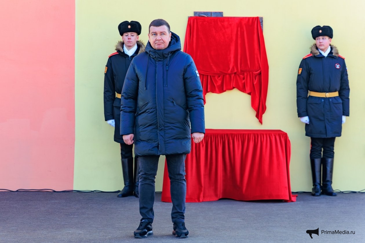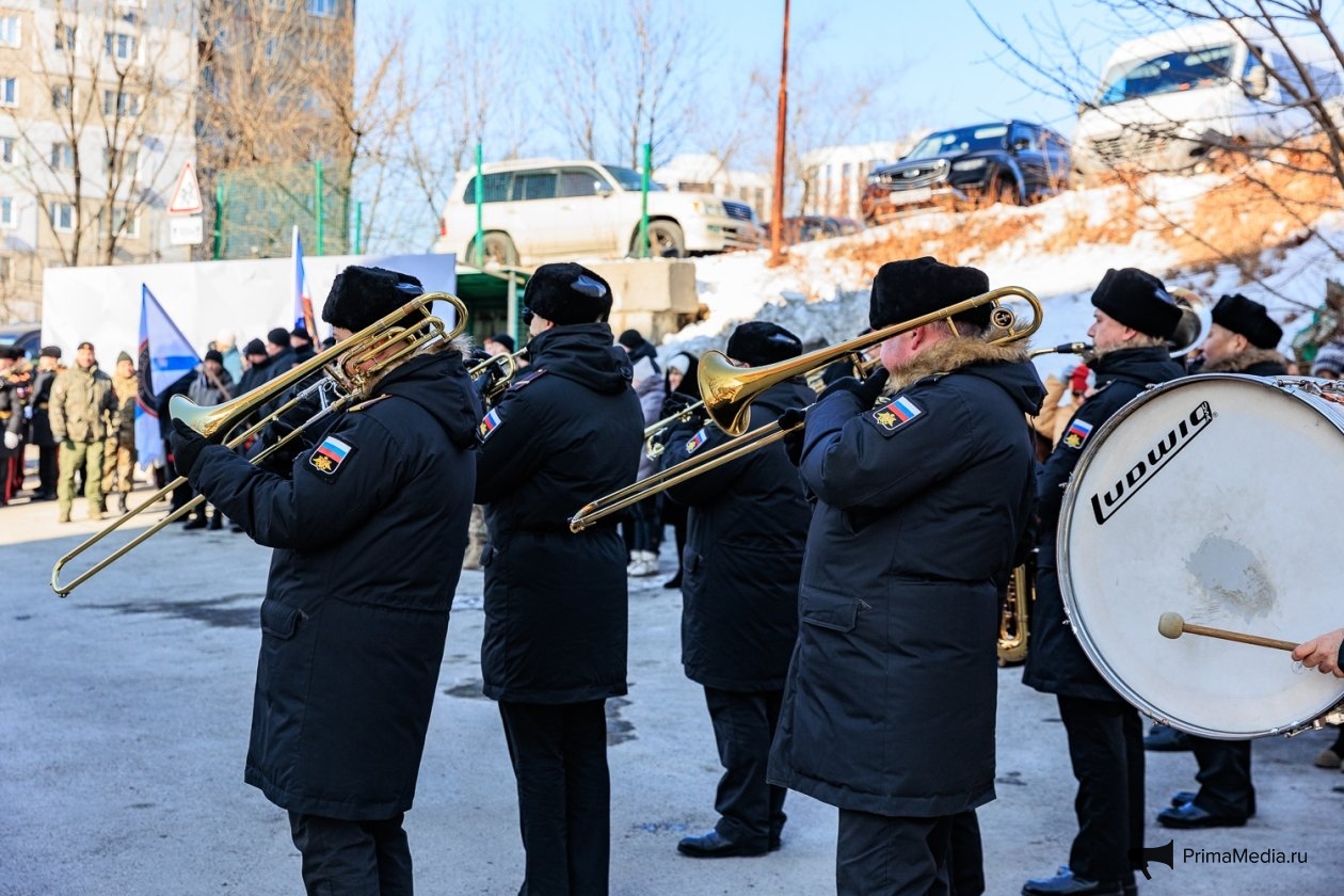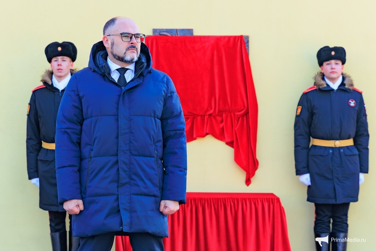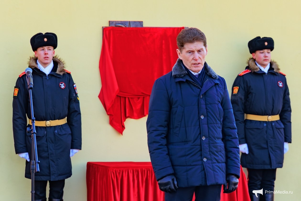 Право открыть мемориальную доску было предоставлено губернатору Приморья и брату Героя. Вслед за этим собравшиеся возложили к памятному знаку цветы под исполнение живого оркестра.