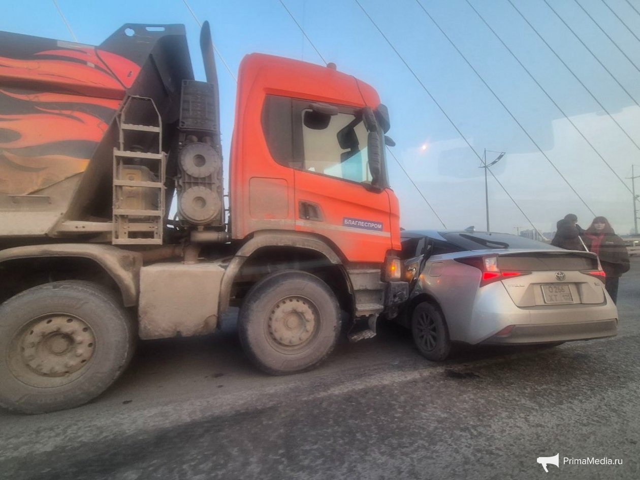 PrimaMedia, 4 февраля. На Золотом мосту во Владивостоке произошло ДТП с участием грузовика и легкового автомобиля Toyota Prius.