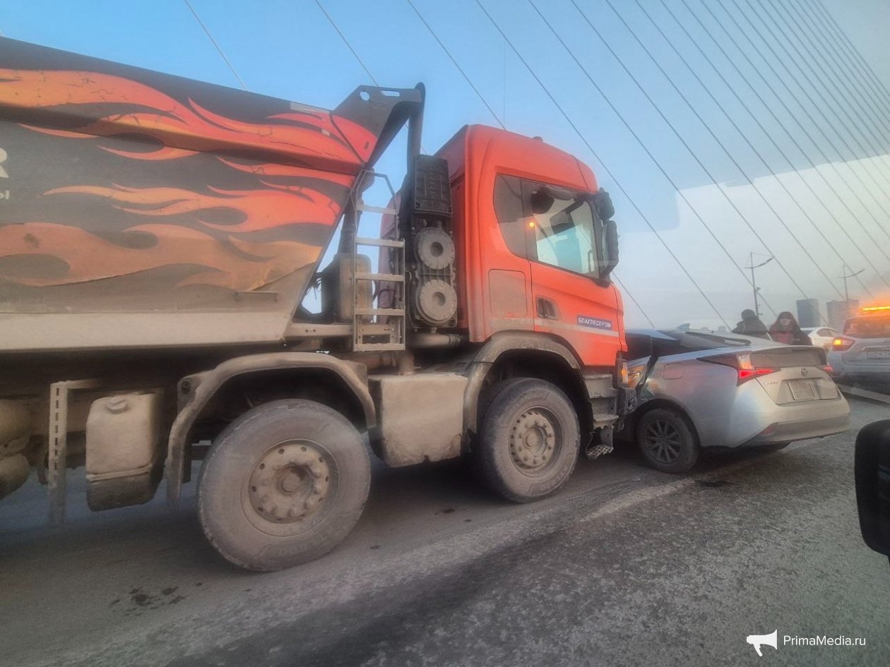 На Золотом мосту во Владивостоке столкнулись большегруз и Toyota Prius. Фото: ИА PrimaMedia
