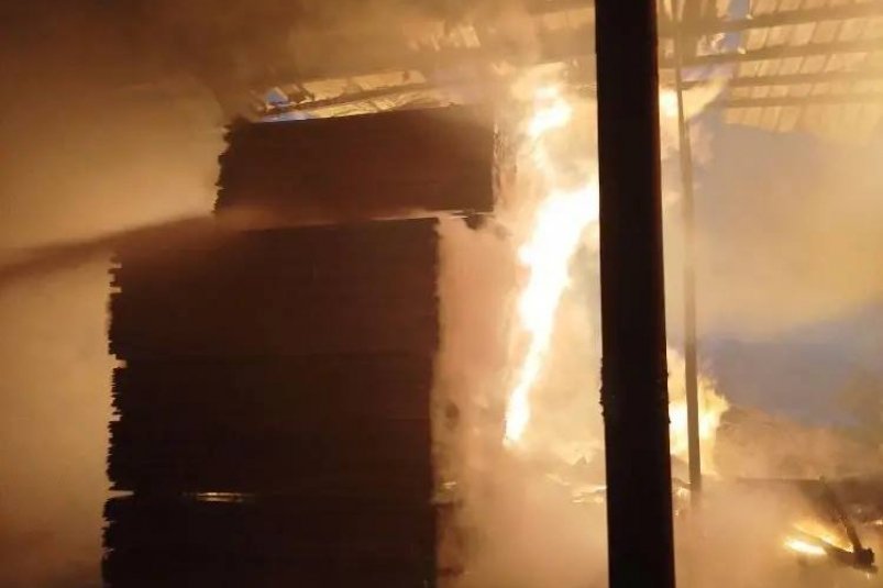 "По прибытию на место выяснилось, что горят штабеля пиломатериала внутри производственного цеха. Ситуация была оценена как пожар ранга 1Бис с площадью горения 150 квадратных метров. В тушении были задействованы три единицы техники и одиннадцать человек личного состава", — говорится в сообщении.