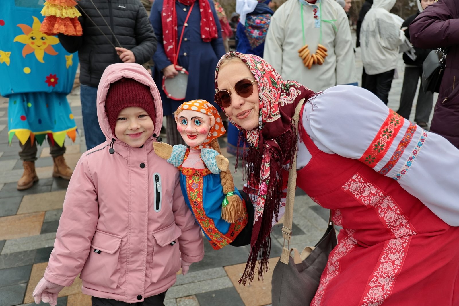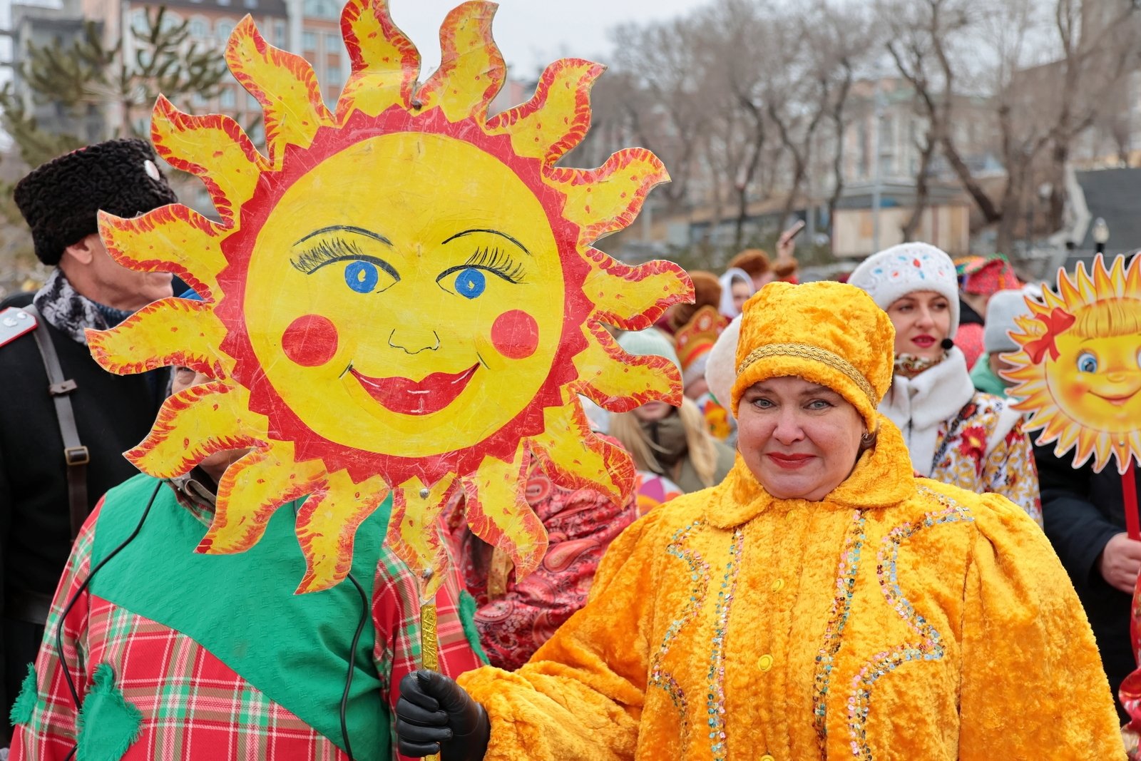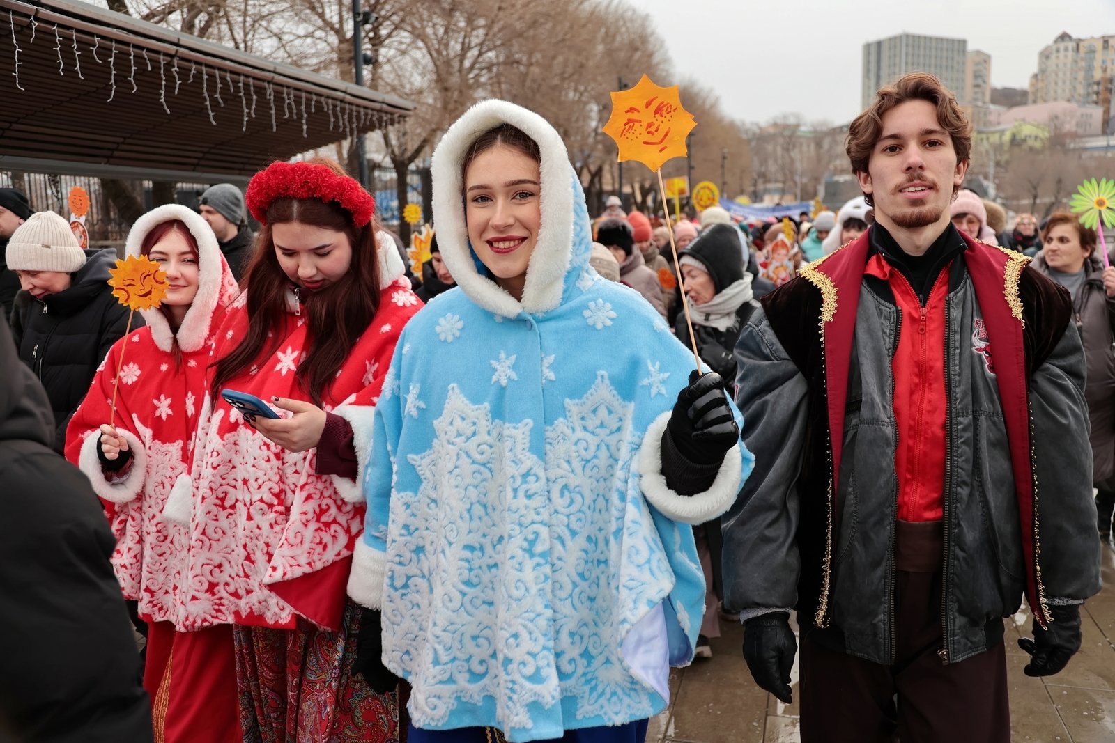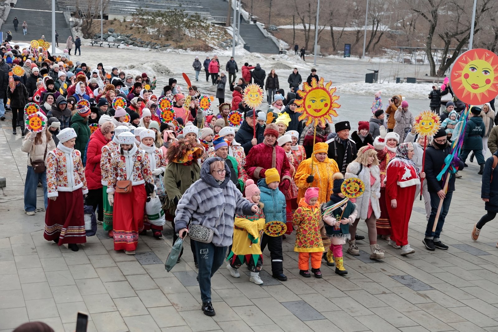 Старт народным гуляньям дало колоритное шествие. В 11.50 от большого фонтана на набережной Спортивной гавани стартовал интерактивный "Масленичный поезд": сотни жителей и гостей города в ярких тематических костюмах, с песнями и праздничным инвентарем проследовали по набережной к главной сцене у центра "Россия".