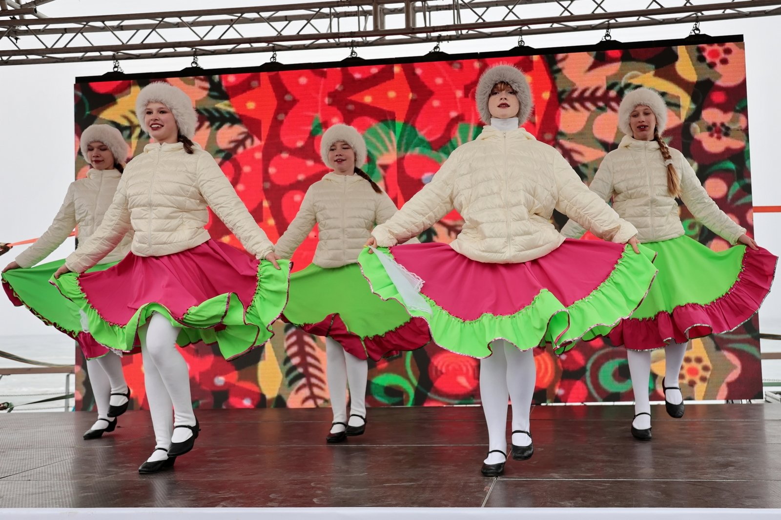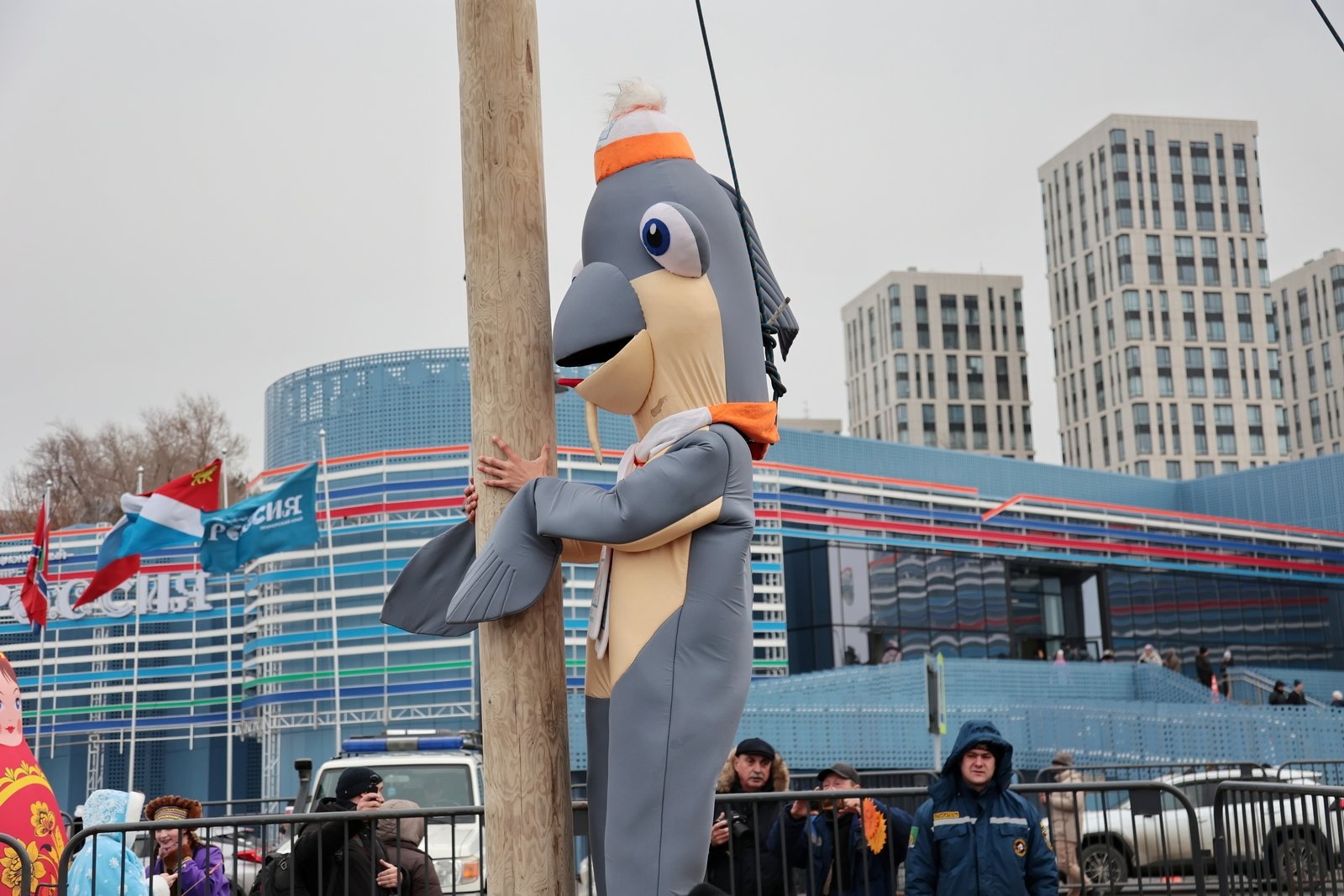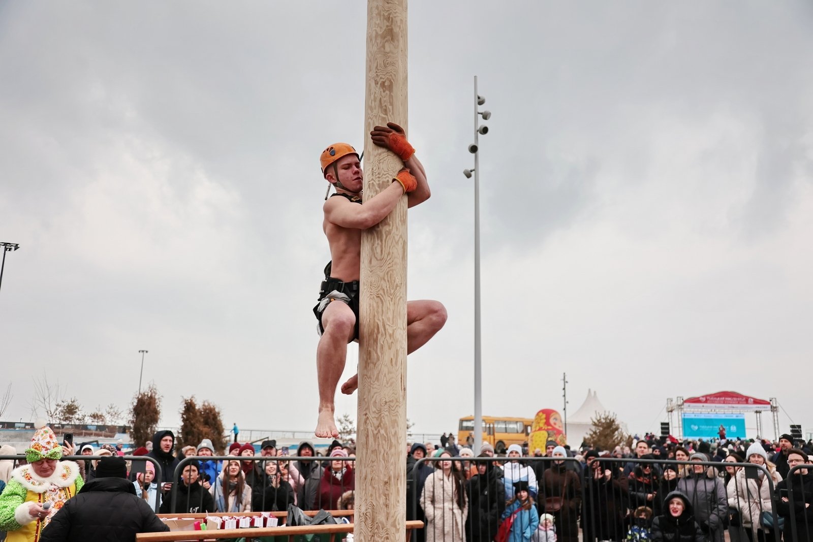 На площадке у центра для гостей развернулась насыщенная программа. С полудня на сцене выступали творческие коллективы, работали ярмарка ремесел и развлекательные зоны, где можно было поучаствовать в играх и хороводах. Самые ловкие и смелые пытались покорить высокий масленичный столб, и те, кому это удалось, получили ценные подарки, одним из главных был телевизор.