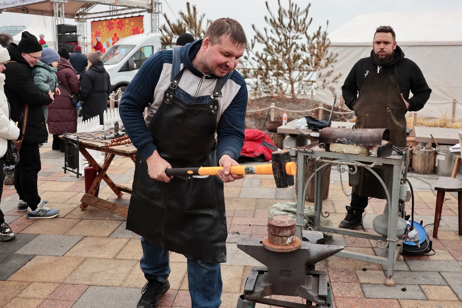 Одним из самых трогательных и зрелищных обрядов дня стала "кузнечная свадьба". Молодожены Матвей Назаренко и Юлия Сорока, которые официально зарегистрировали брак накануне, "сковали" свой союз прямо на празднике. Под руководством опытных мастеров они оставили оттиск на тарелке и выковали гвоздь, закрепив семейный узел. В подарок пара получила подкову на счастье.