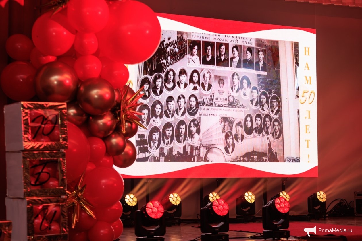 PrimaMedia, 27 февраля. Школа № 56 Владивостока отметила полувековой юбилей. В пятницу, 20 февраля, родные стены учебного заведения вновь наполнились голосами выпускников разных лет, учителей, многие из которых уже давно наслаждаются заслуженным отдыхом на пенсии, а также почетных гостей и ветеранов, сообщает ИА PrimaMedia.