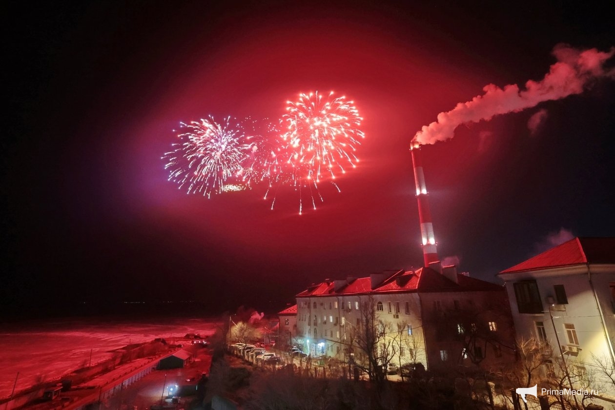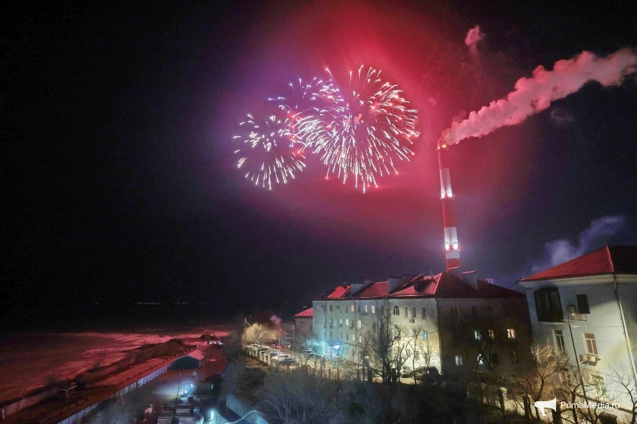 PrimaMedia, 23 февраля. Во Владивостоке празднование 23 февраля завершилось красочным салютом на берегу Амурского залива.